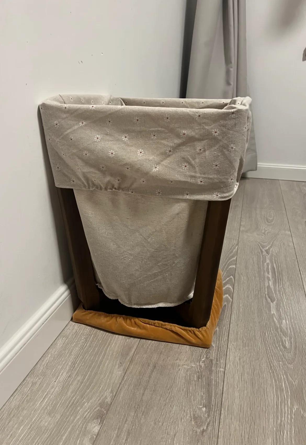 更絕的是下圖,換個思路,把舊凳子倒扣過來(座面朝下),套個亞麻布袋,居然是一個極簡髒衣簍。