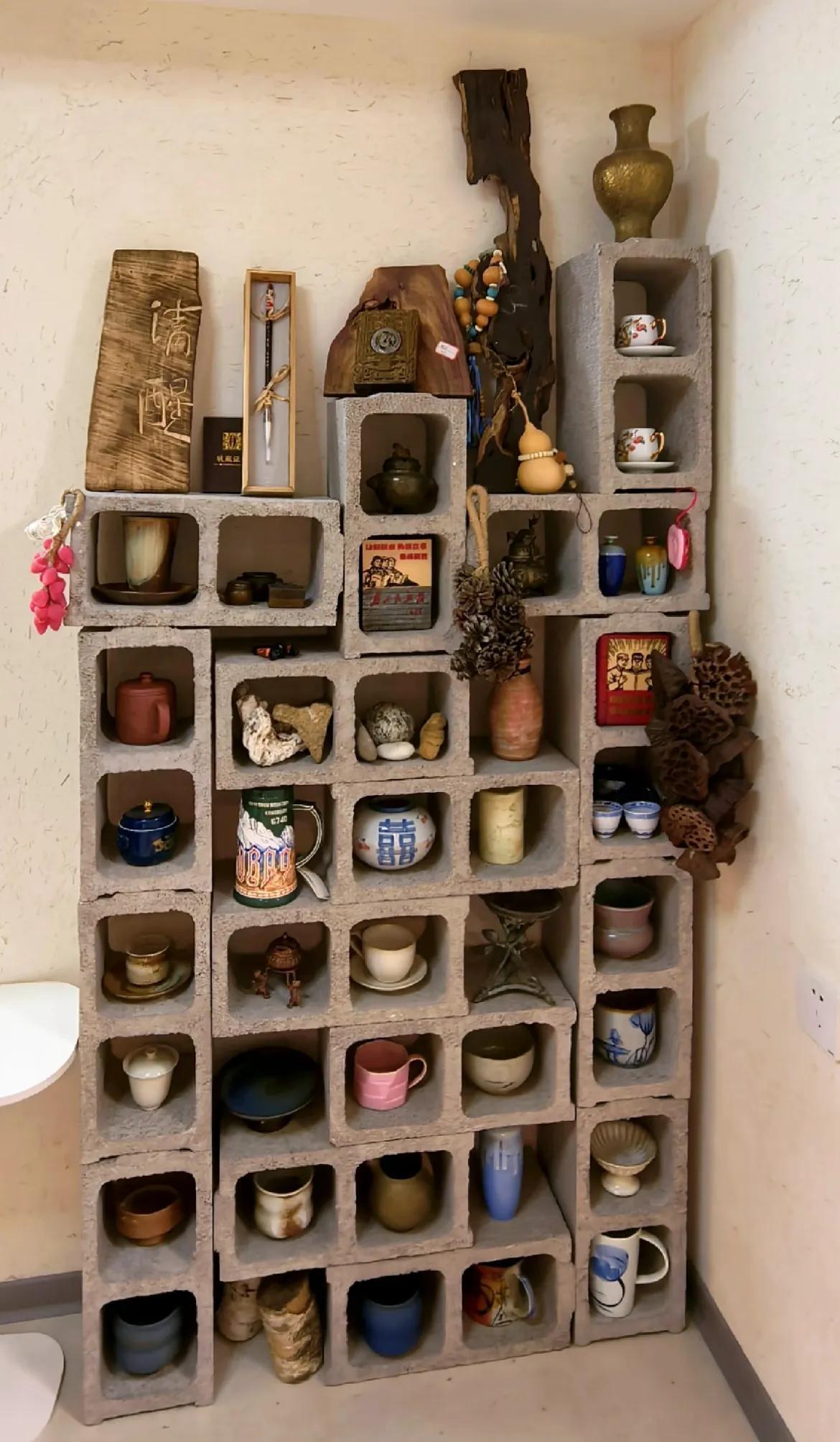 如果你家也有,不妨看看網友@女藝人的做法,把廢棄的空心磚堆到家裏,然後再把杯盤碗盞放進去,粗糲質感,反而有種“咖啡館”的調調。