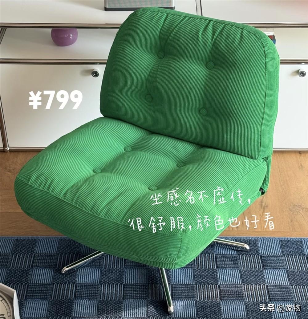 宜家經典的矮靠背沙發椅,坐墊和靠背都特別厚實,坐在上面有種臀背都被包裹起來的感覺,特別舒服,但因爲不鏽鋼腳架+珊瑚絨椅面用料實在,填充也不易塌陷,價格還是稍微貴上一些的,但我個人覺得值。