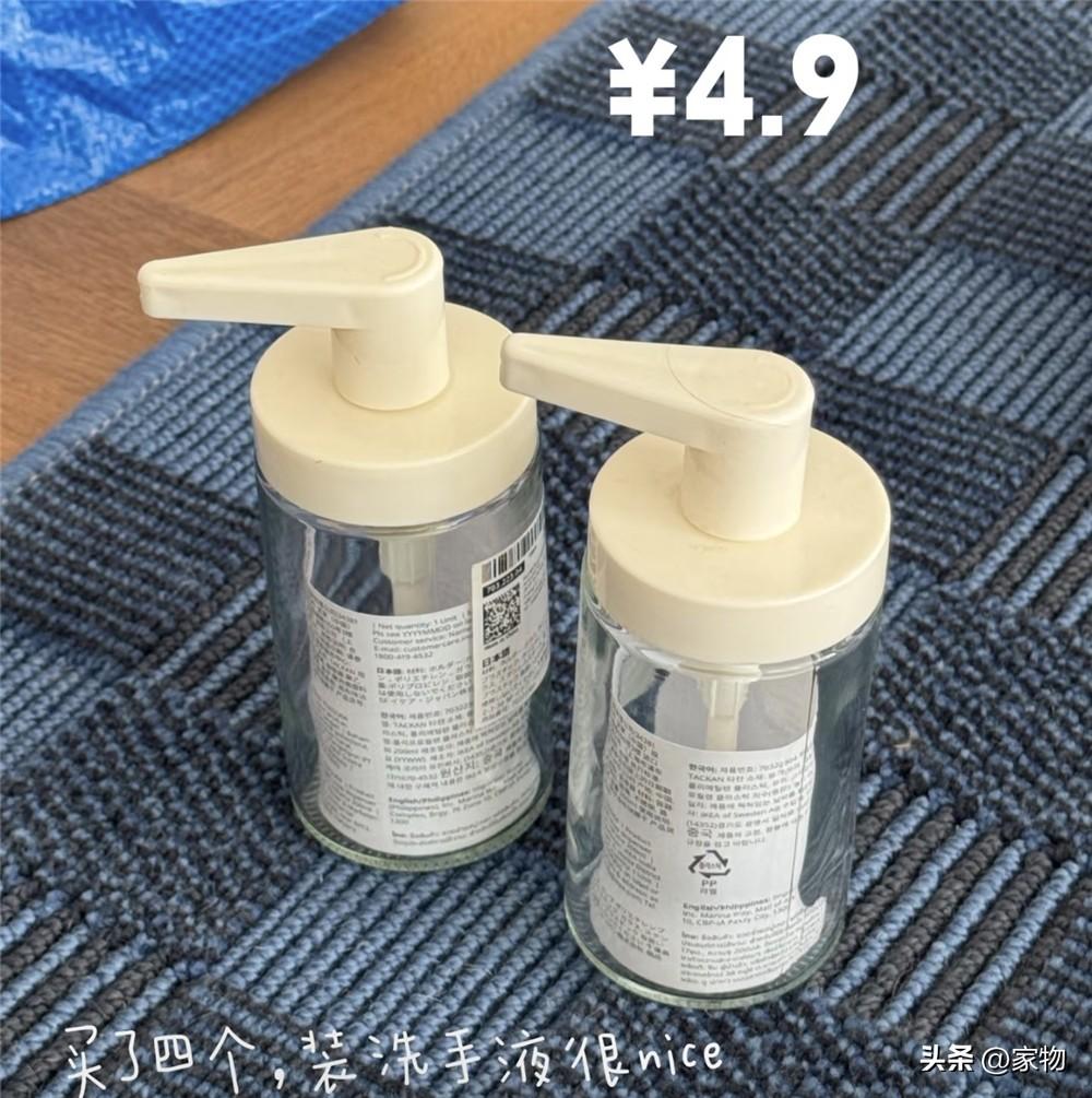 最後就是這個分裝瓶拉,我是沒想到,這四五塊的東西居然還是玻璃瓶的,而且泵頭按壓也是特別順暢,用它來分裝洗漱沐浴用品或其他清潔劑都很合適,更不用說它擰開以後瓶口還很大,方便往裏增添清潔液,真的挑不出什麼毛病。