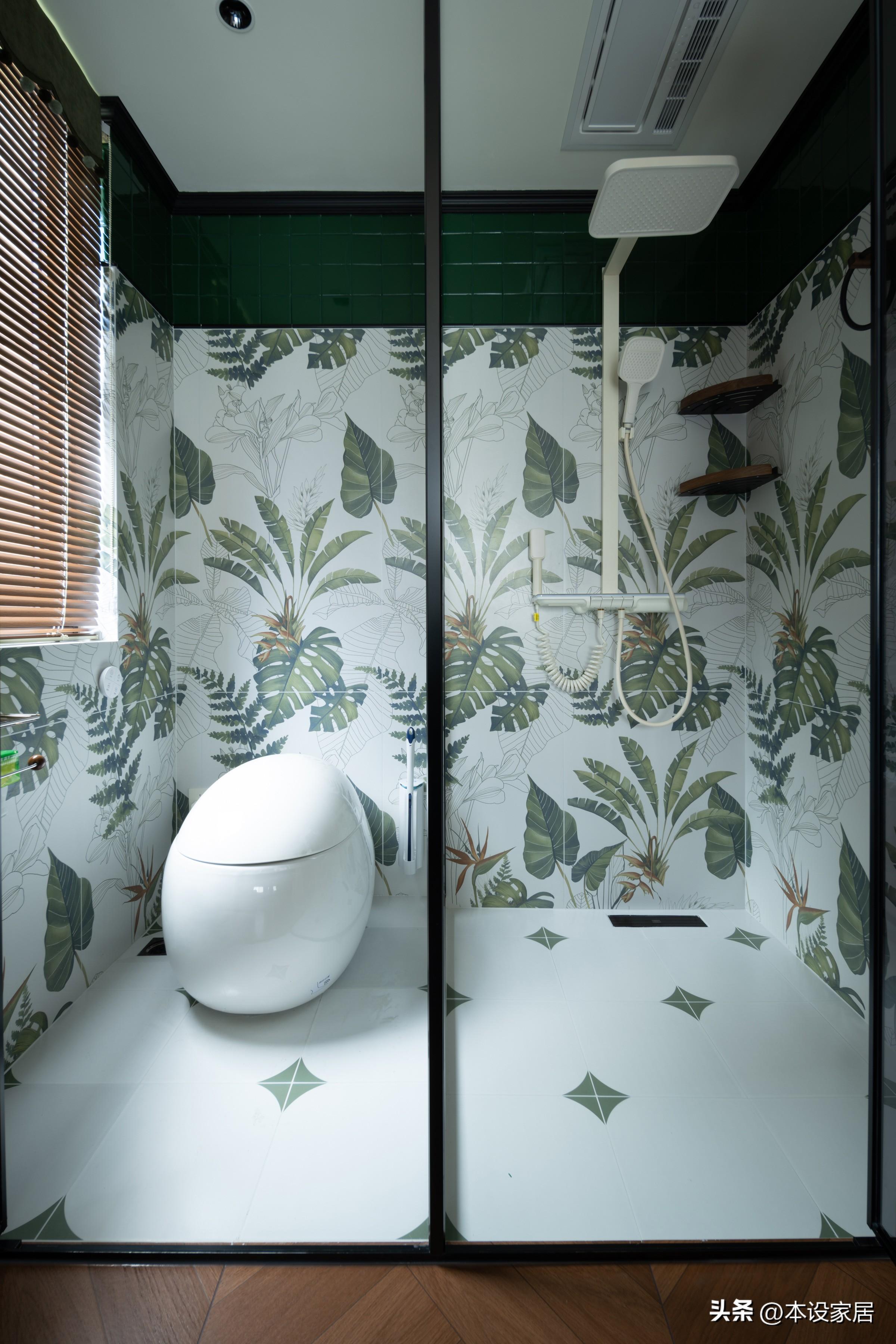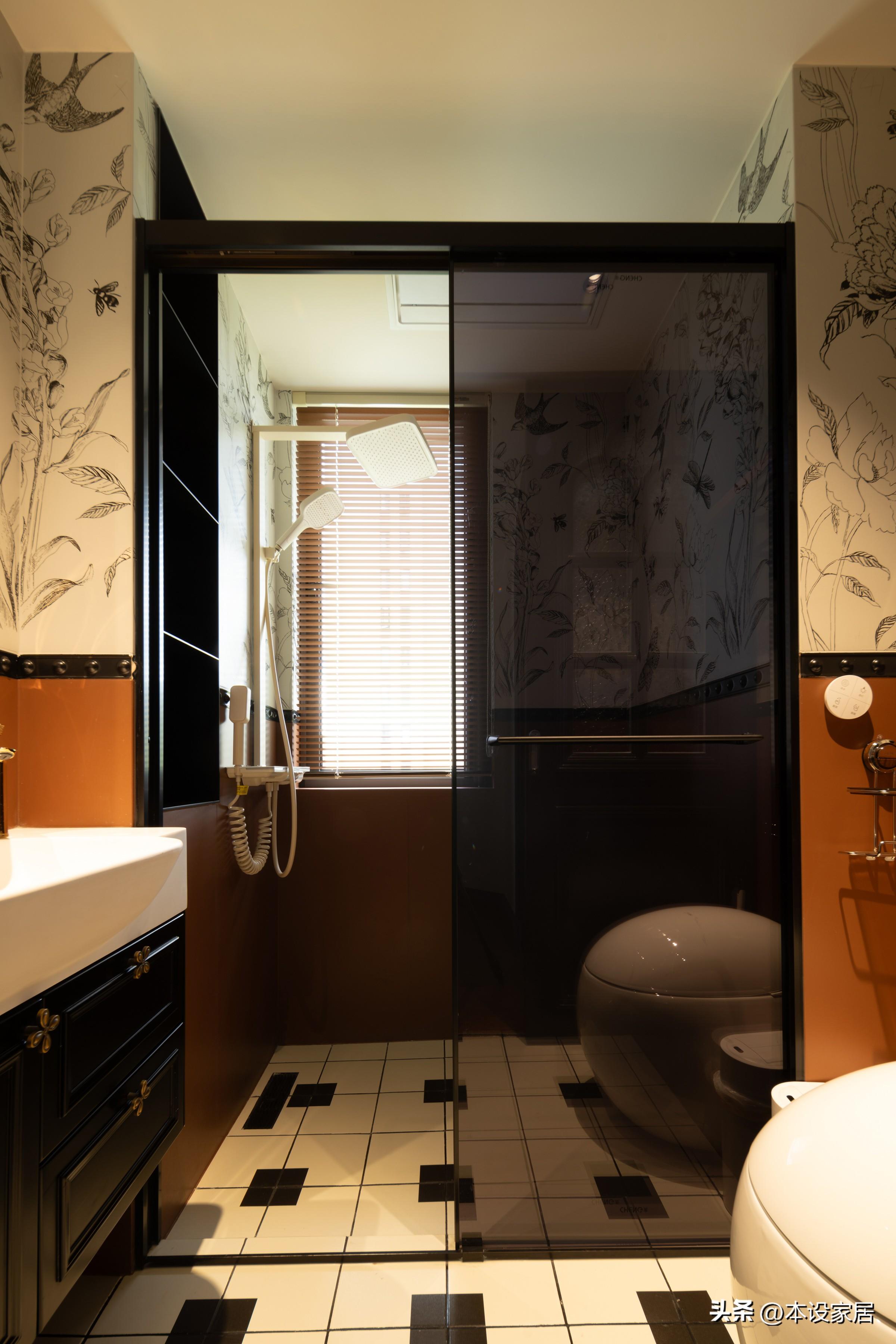 改造後的主衛和次衛,用雙層玻璃屏風做了隔斷,黑色鐵藝不規則外觀精巧,保護隱私,而不同圖案花磚的採用,也不乏觀賞性。