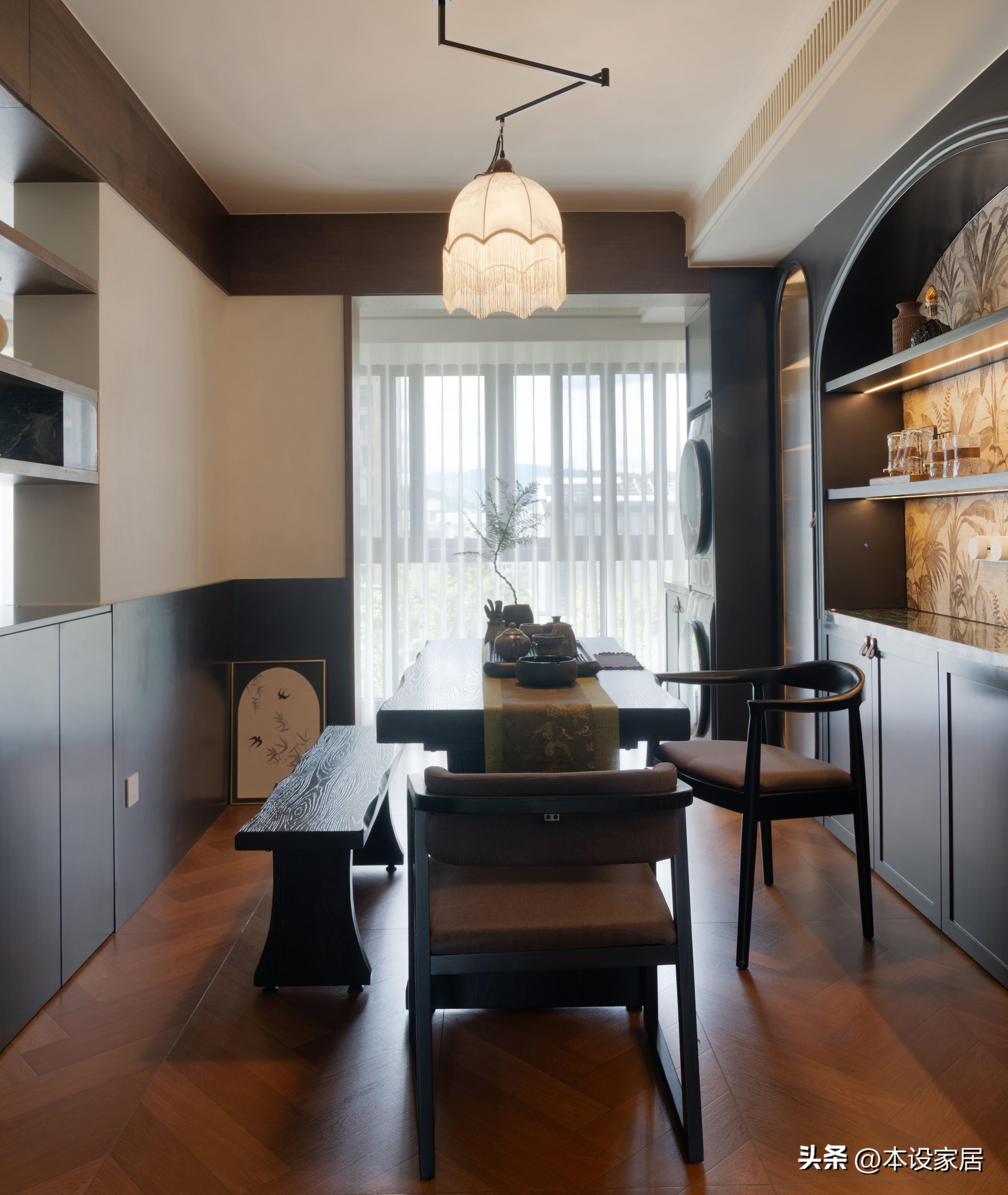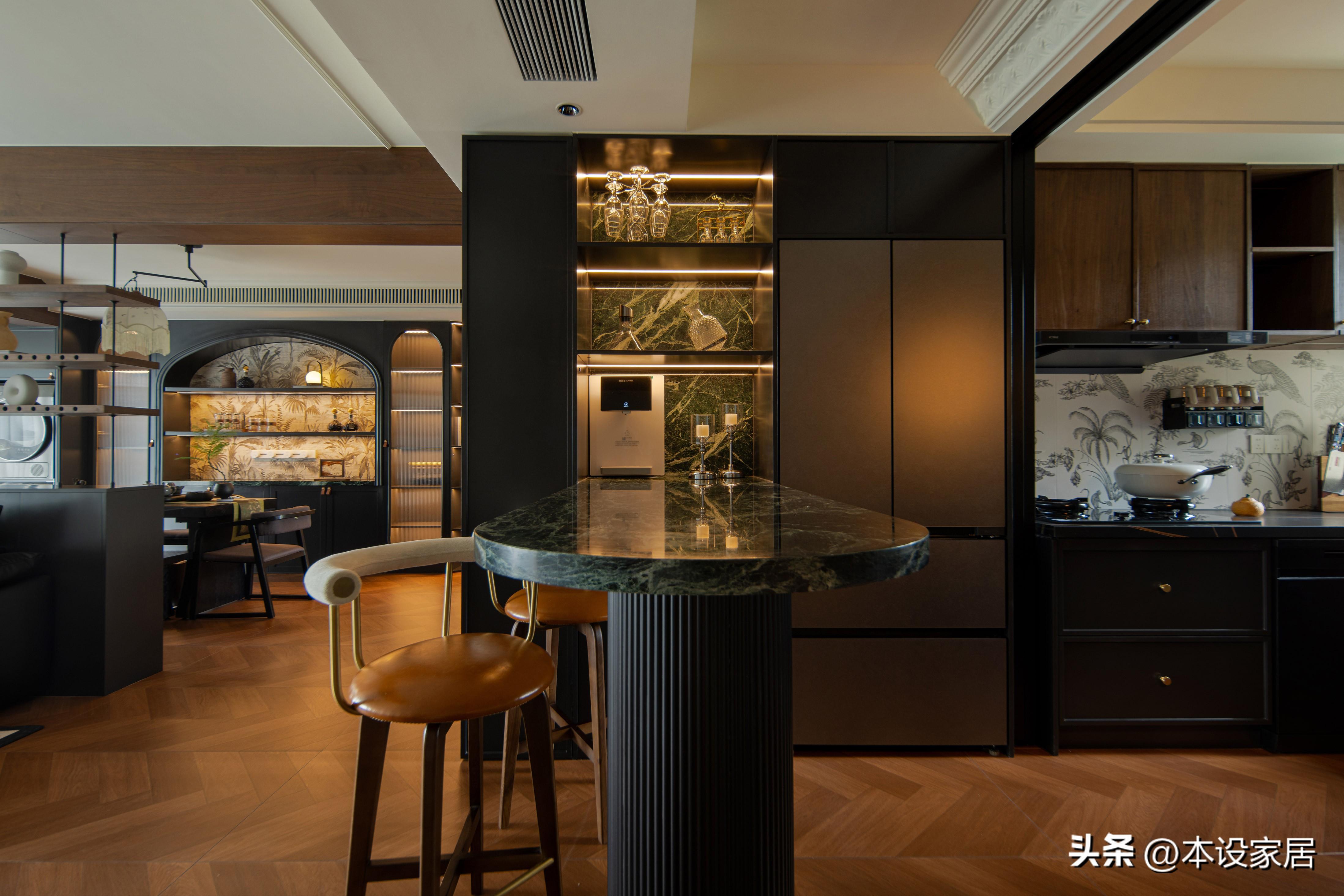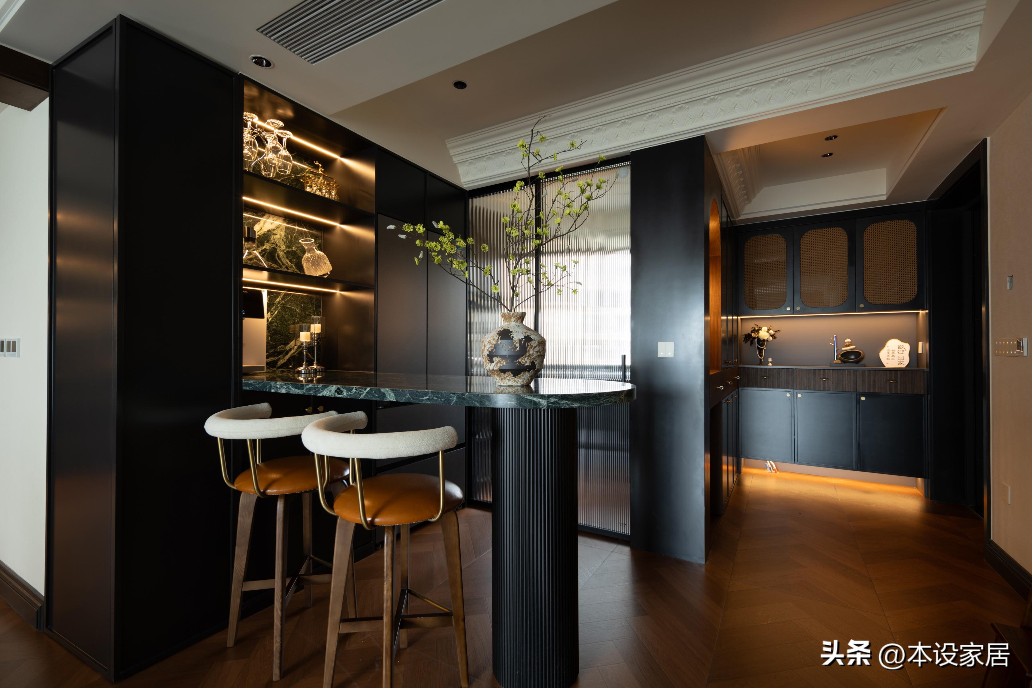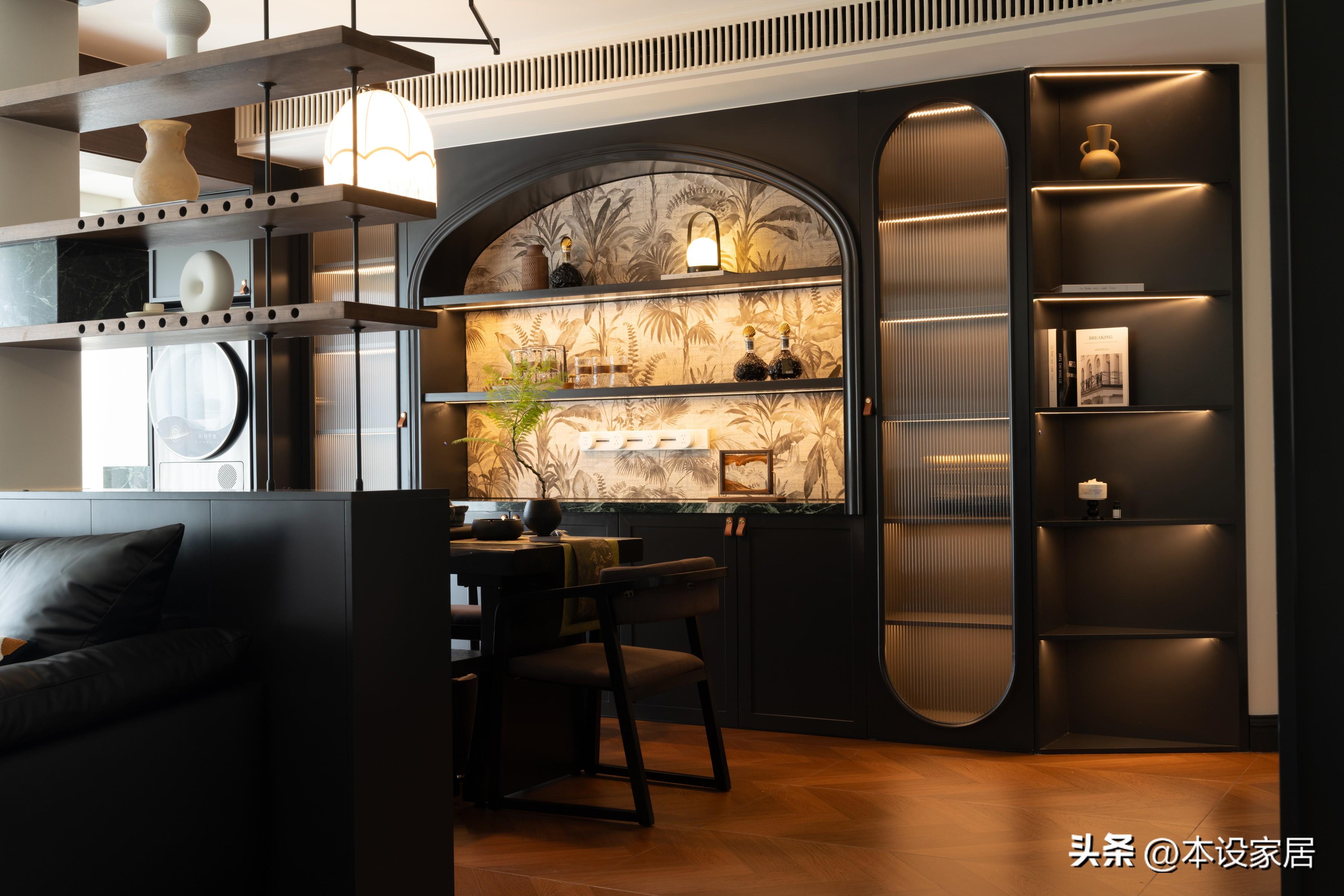 往裏是原餐廳改小吧檯,靠牆定製到頂的餐邊櫃,功能強大,集展示、收納和裝飾於一體,而且靠近廚房,在這裏喫個早餐,意興正酣時也可以小酌一杯,夫婦倆漫數生活裏的細碎日常,真的格調滿滿。