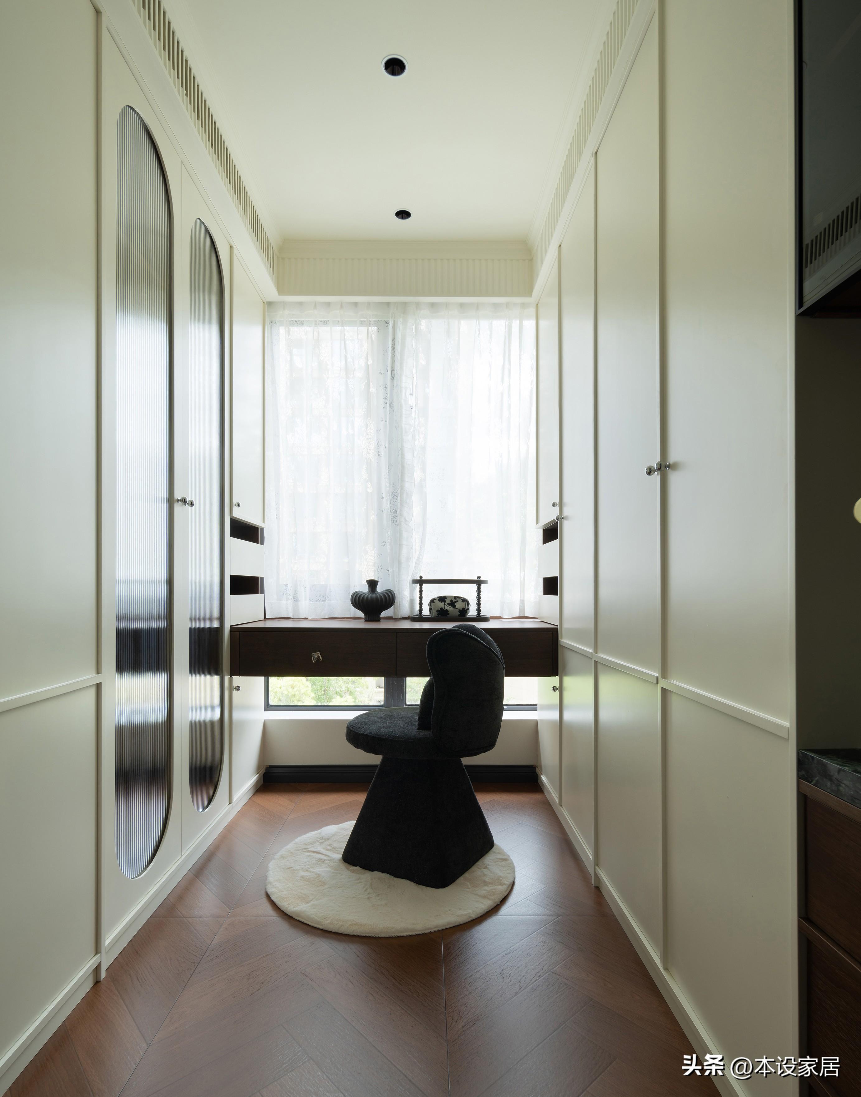 北面的小臥室改造成衣帽間,靠牆定製兩排衣櫃,滿足夫婦倆衣物的收納需求,而乳白色的櫃門,也減少小空間的逼仄感。