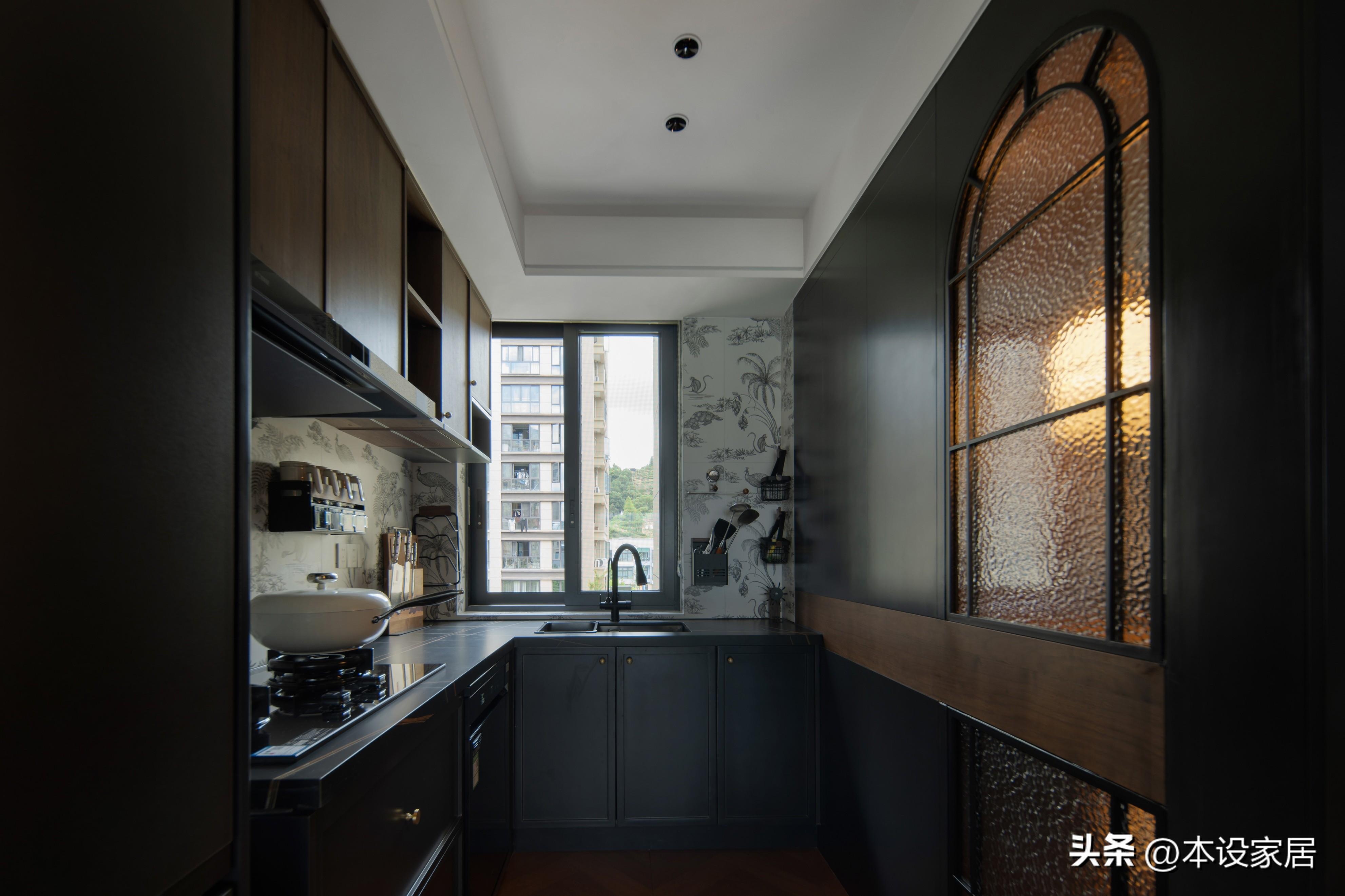 廚房和玄關之間局部使用水紋玻璃做隔斷,不僅能增加採光,更爲兩個空間創造出互動的可能性。