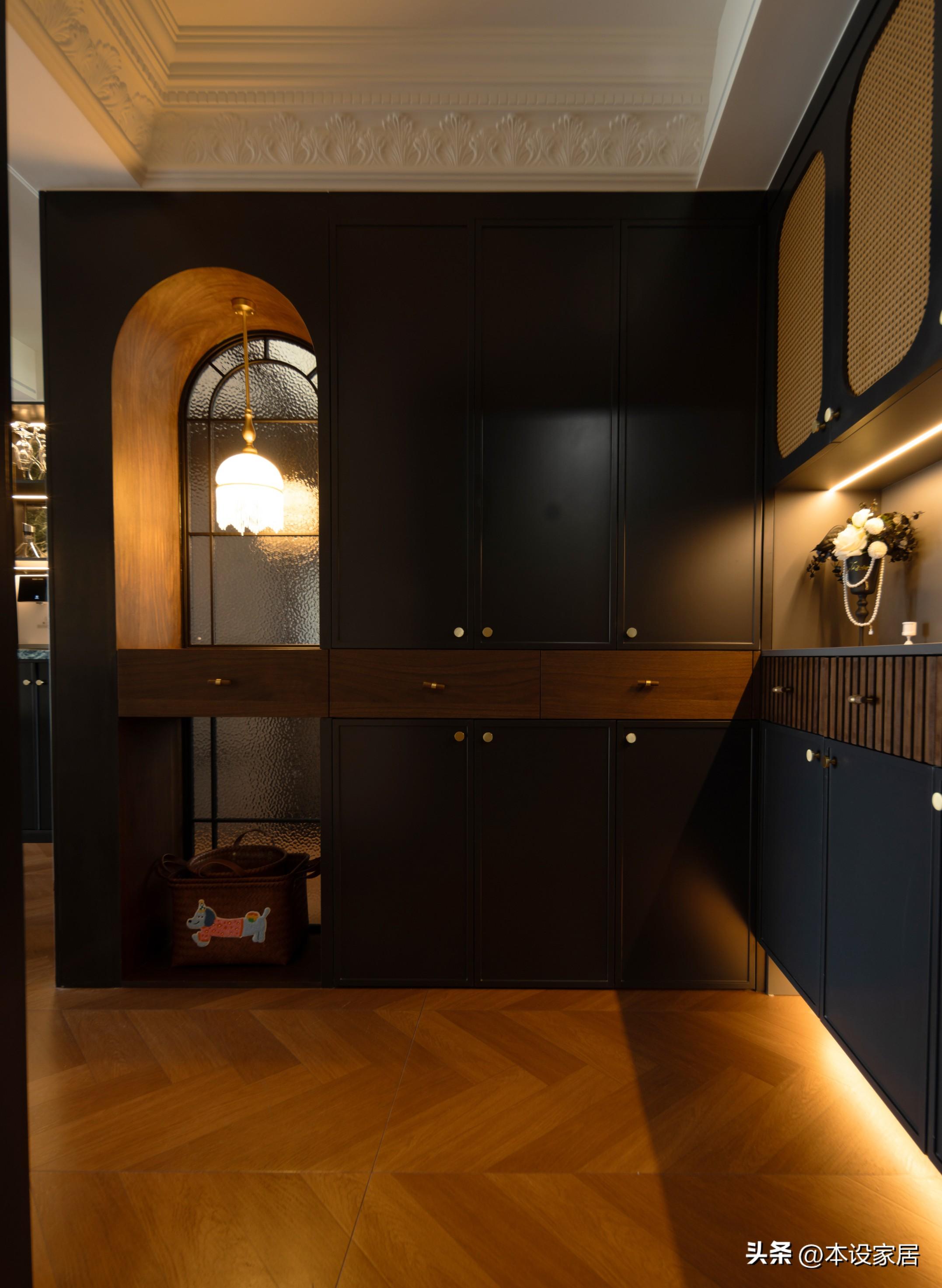 打開入戶門,結合廚房設計了一組L型的儲物櫃,也改變原始的封閉感受,實木+藤編+弧形元素的組合,目之所及,皆是溫馨、優雅與質感。