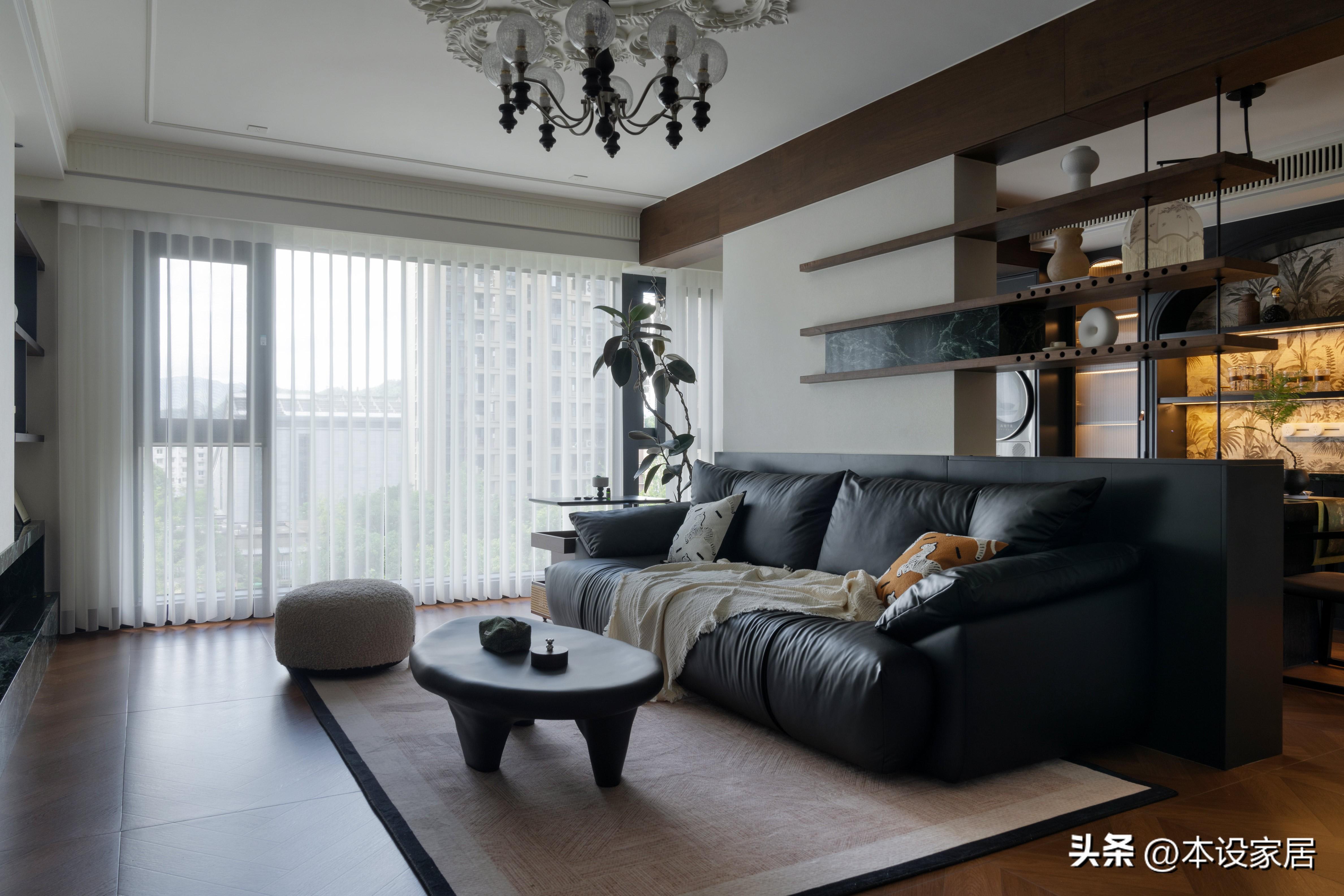 客廳擁有寬大的落地玻璃窗,採光充足,最絕的的電動夢幻簾,不僅可以一鍵開和關,還能360°旋轉,控制空間明暗,真高級。