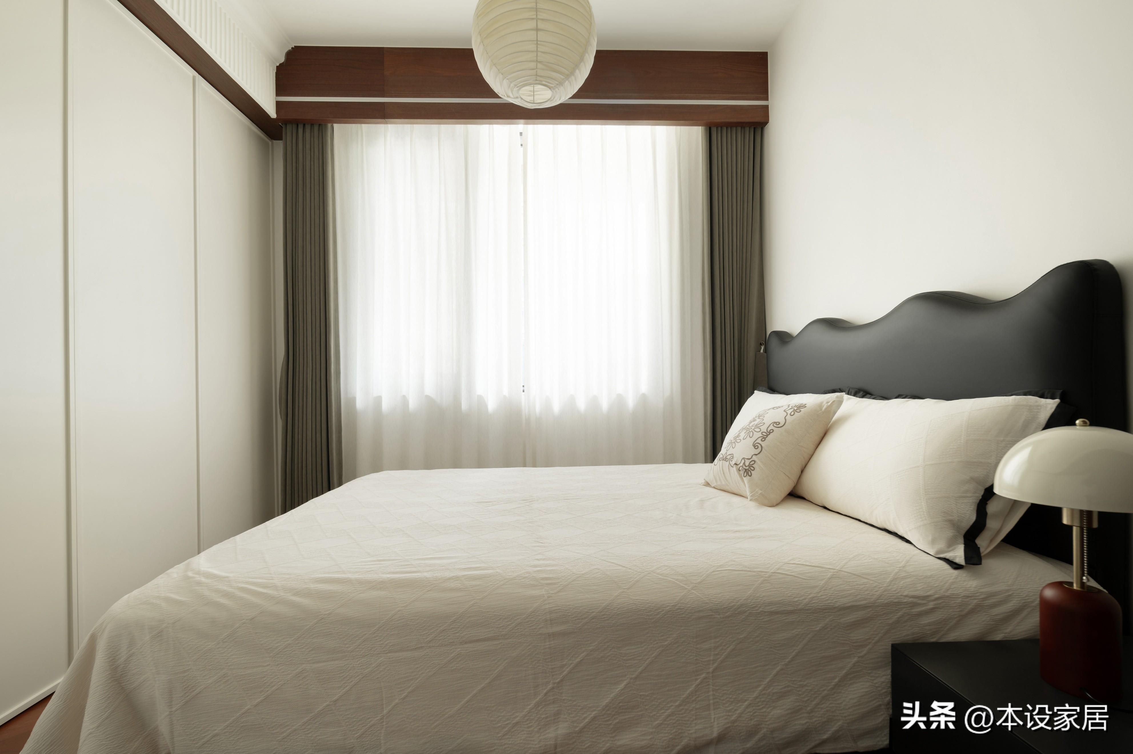 主臥延續了客餐廳的格調,米白色牆面與黑胡桃木色傢俱的搭配,窗簾也是溫柔的咖色系,讓人完全地放鬆,也顯得典雅又舒適。