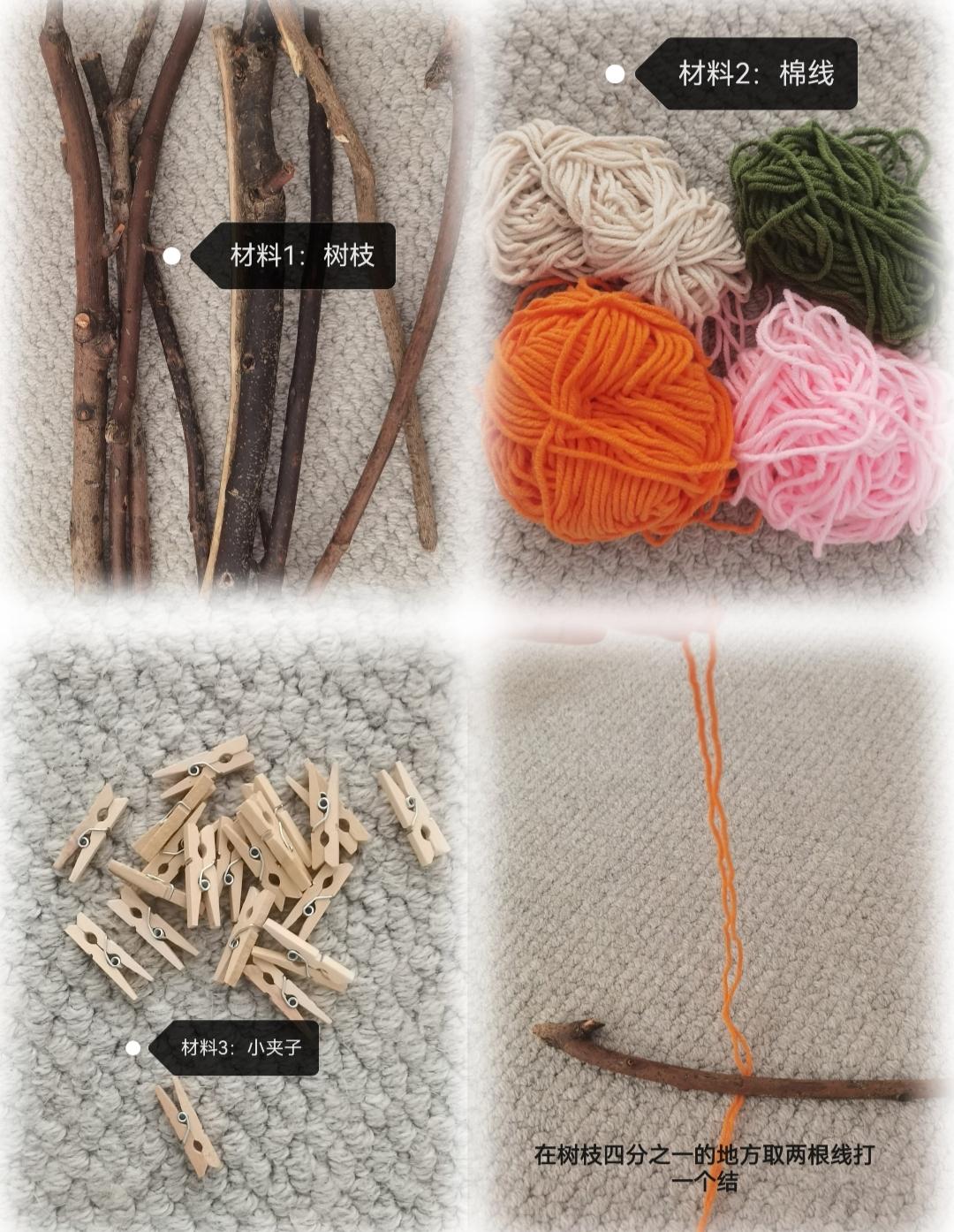 準備材料:撿幾根樹枝、棉線、木質小夾子。