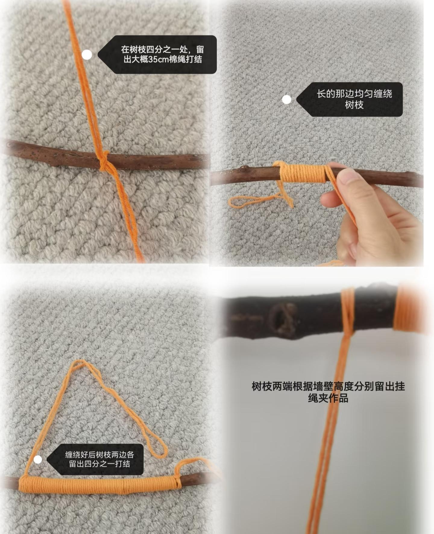 ②在樹枝約四分之一處,用兩根棉線打個結,大概留30cm左右用來掛牆;