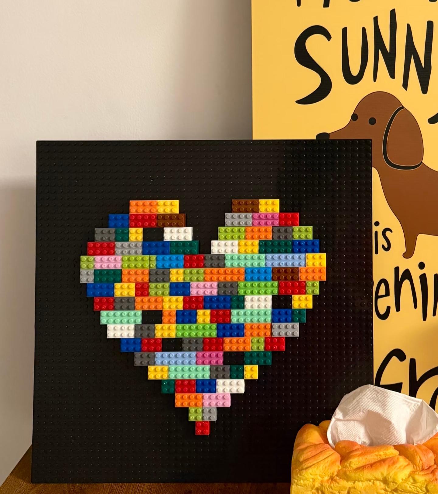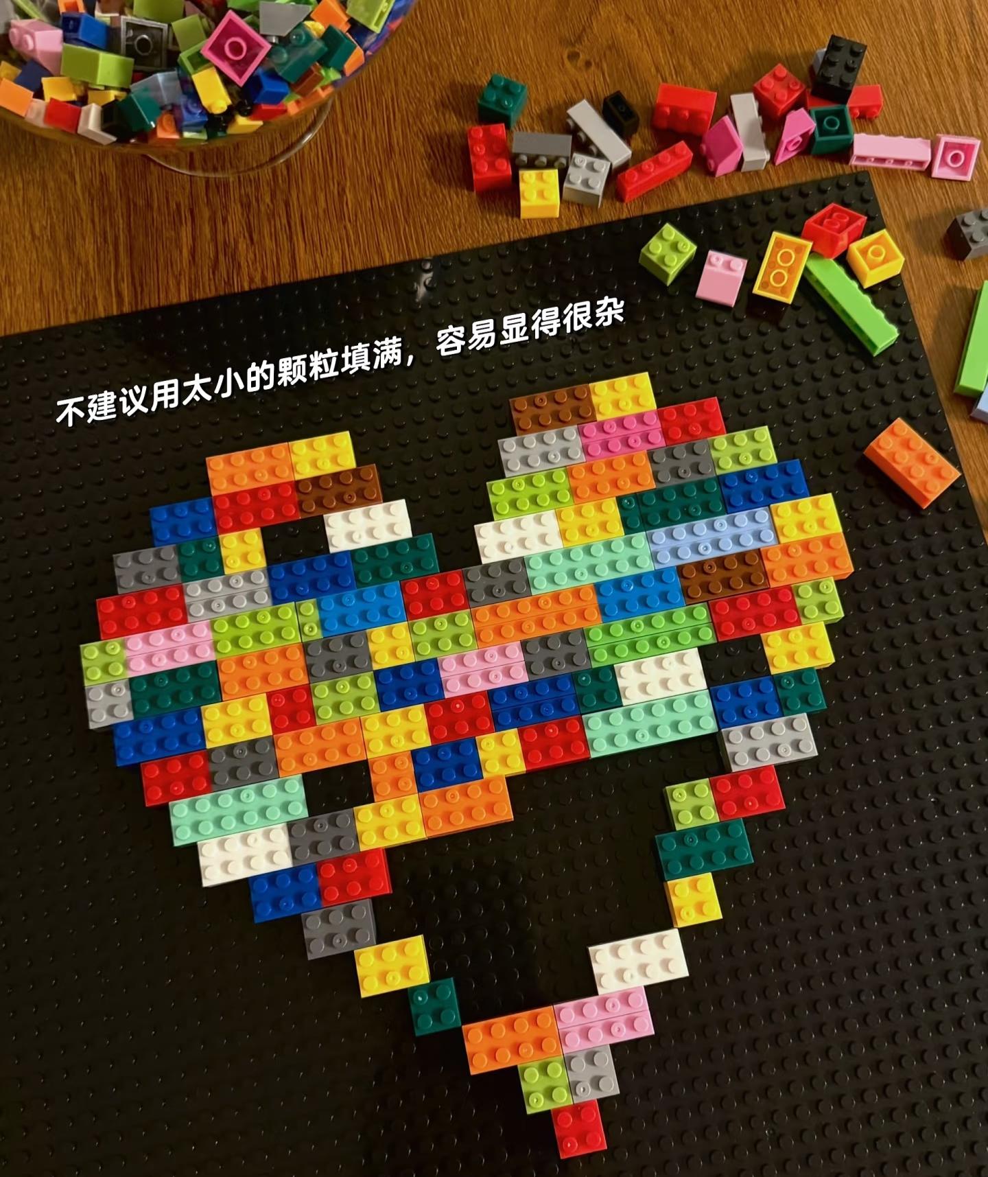 就是用樂高拼成的愛心。說起來牽強,五彩斑斕的黑在於黑色背景,換個背景就不成立了。