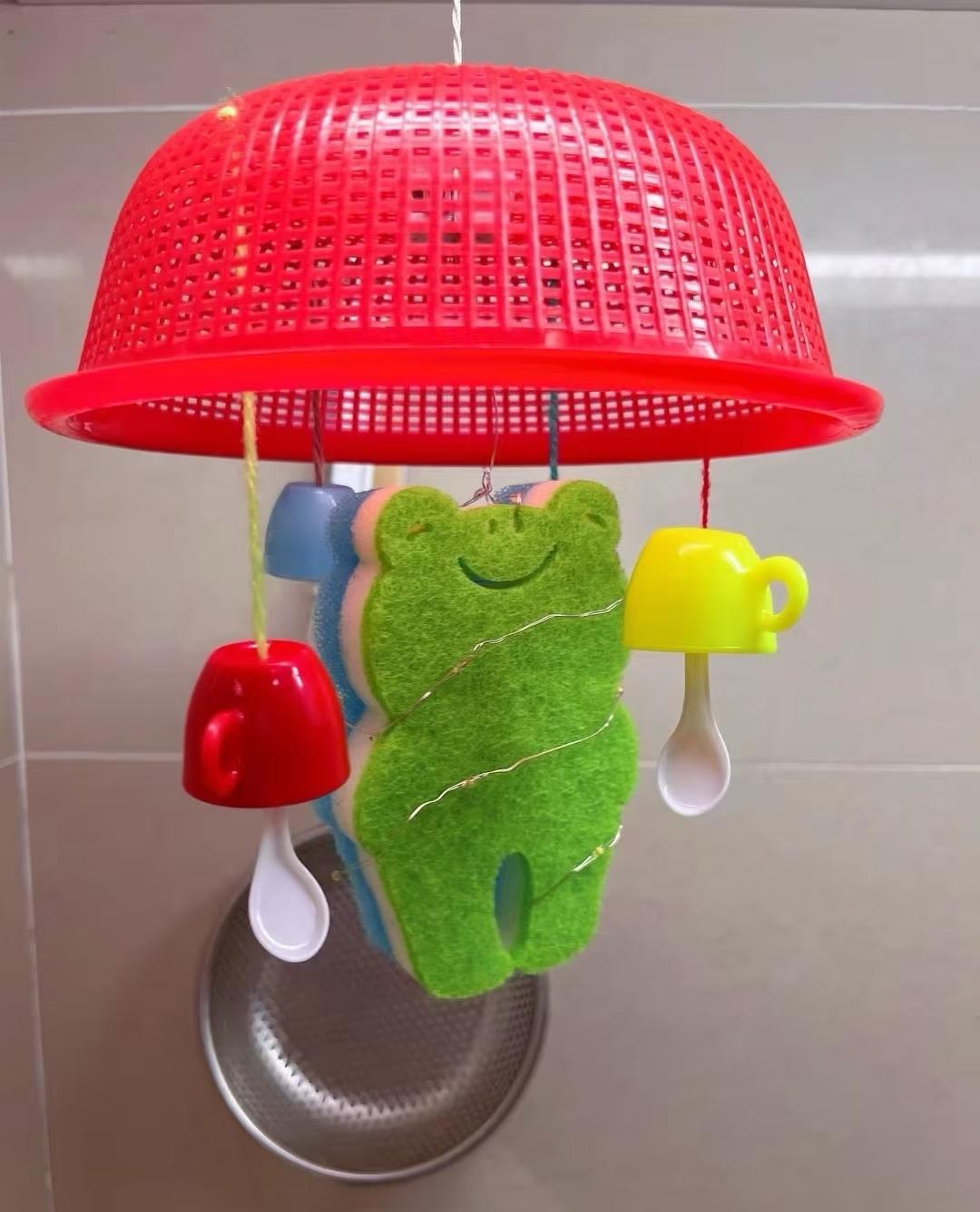 不過這次的風鈴也不全是,除了草莓筐算,洗碗海綿是新的,塑料小杯子、勺子也得買或附贈,毛線也不是從毛衣上拆下來的啊!