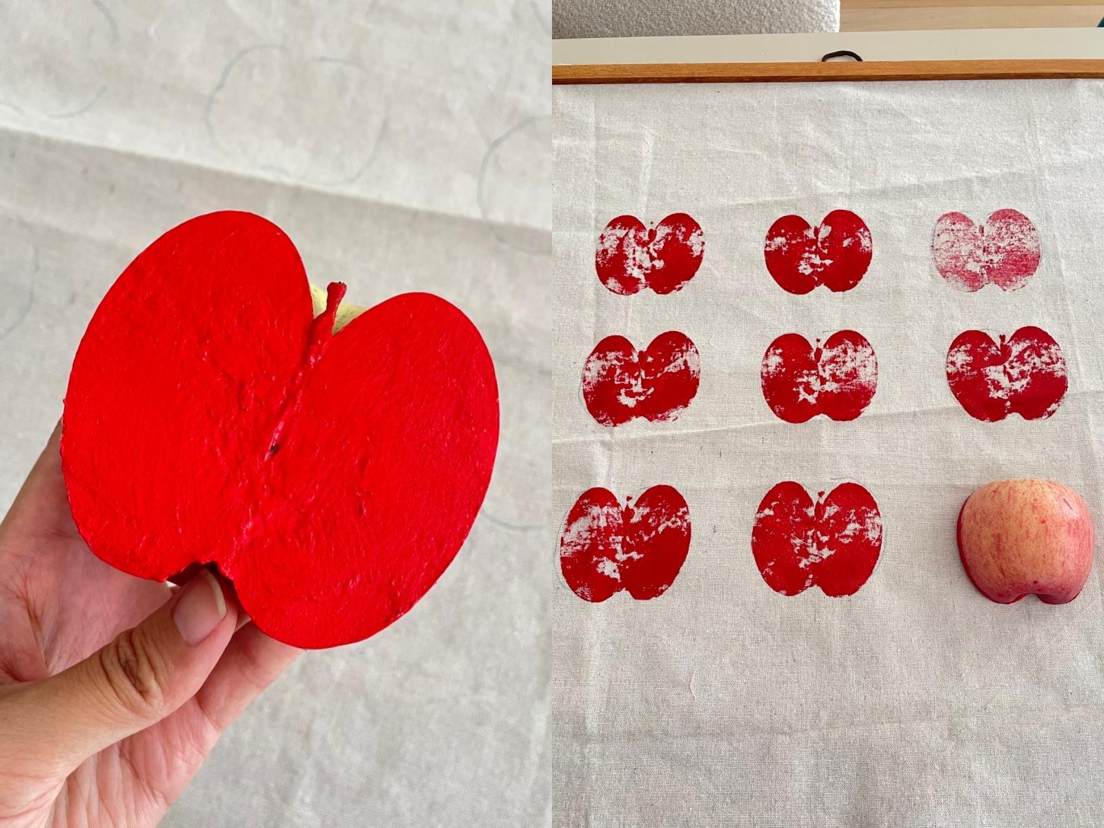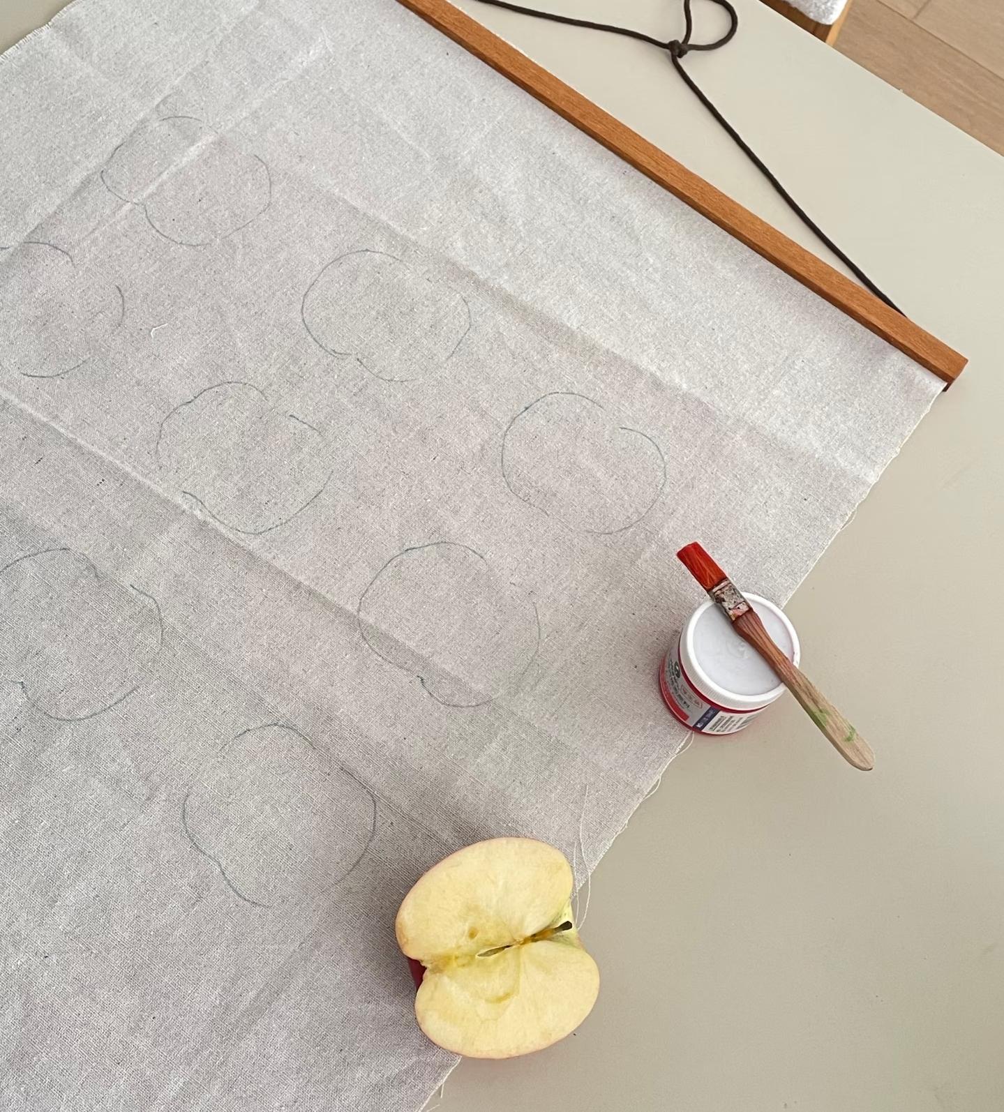準備好後,拓之前蘋果先對半切,用鉛筆在布上描好輪廓;