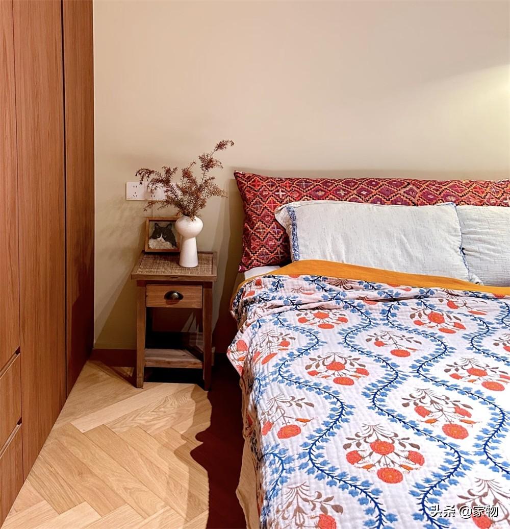 但漂亮的四件套、古舊的牀頭櫃,恰到好處的花瓶點綴,又都爲這間臥室增添了幾分田園質感,看似沒有風格,卻比一切風格都讓人覺得高級。