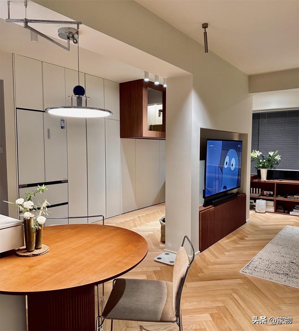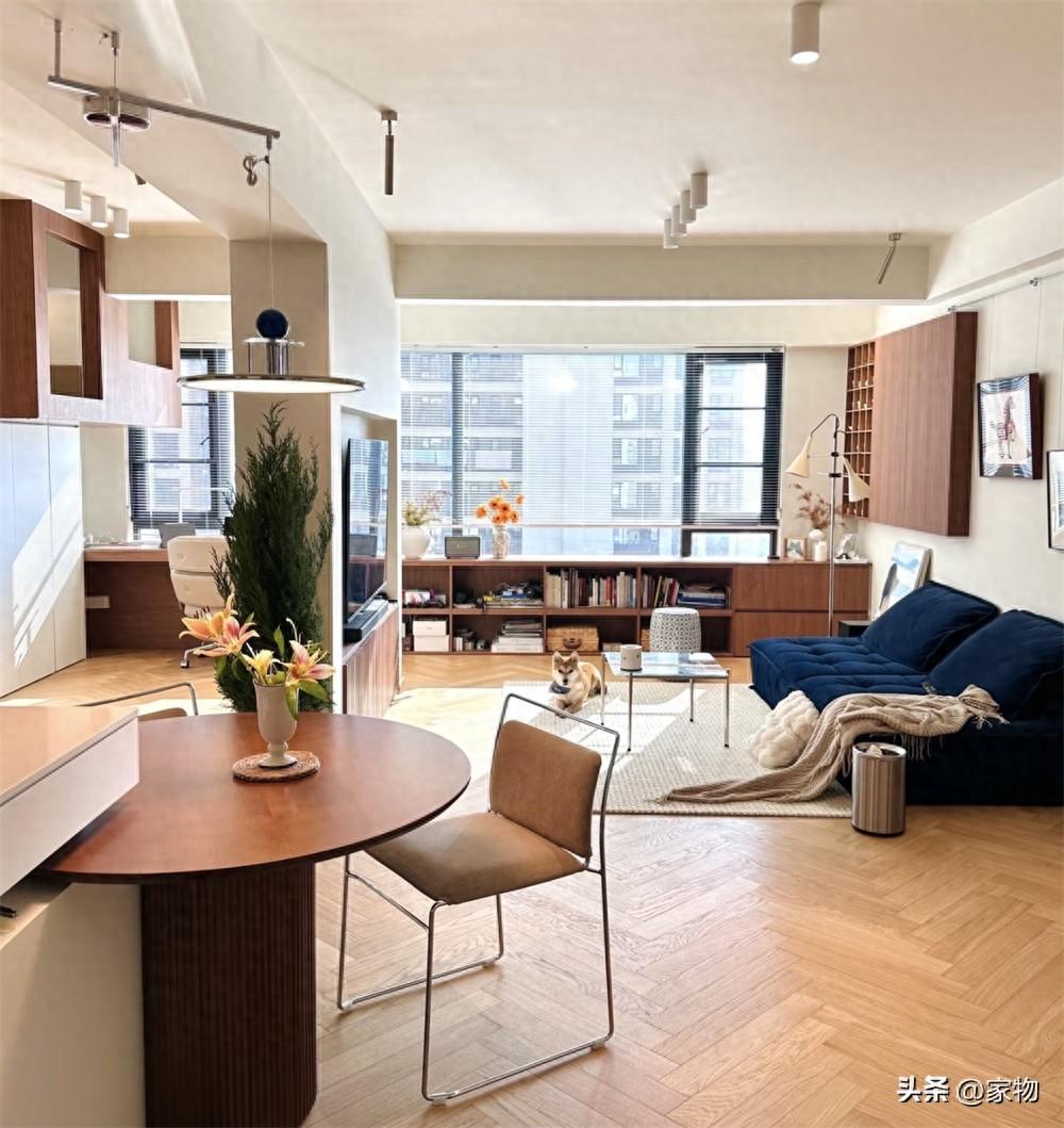 最主要的是,它原本是間小三室戶型,原本有些擁擠,但好在戶型足夠方正,裝修後,更是直接將三室改成兩室戶型,進一步增加了室內空間的通透之感。