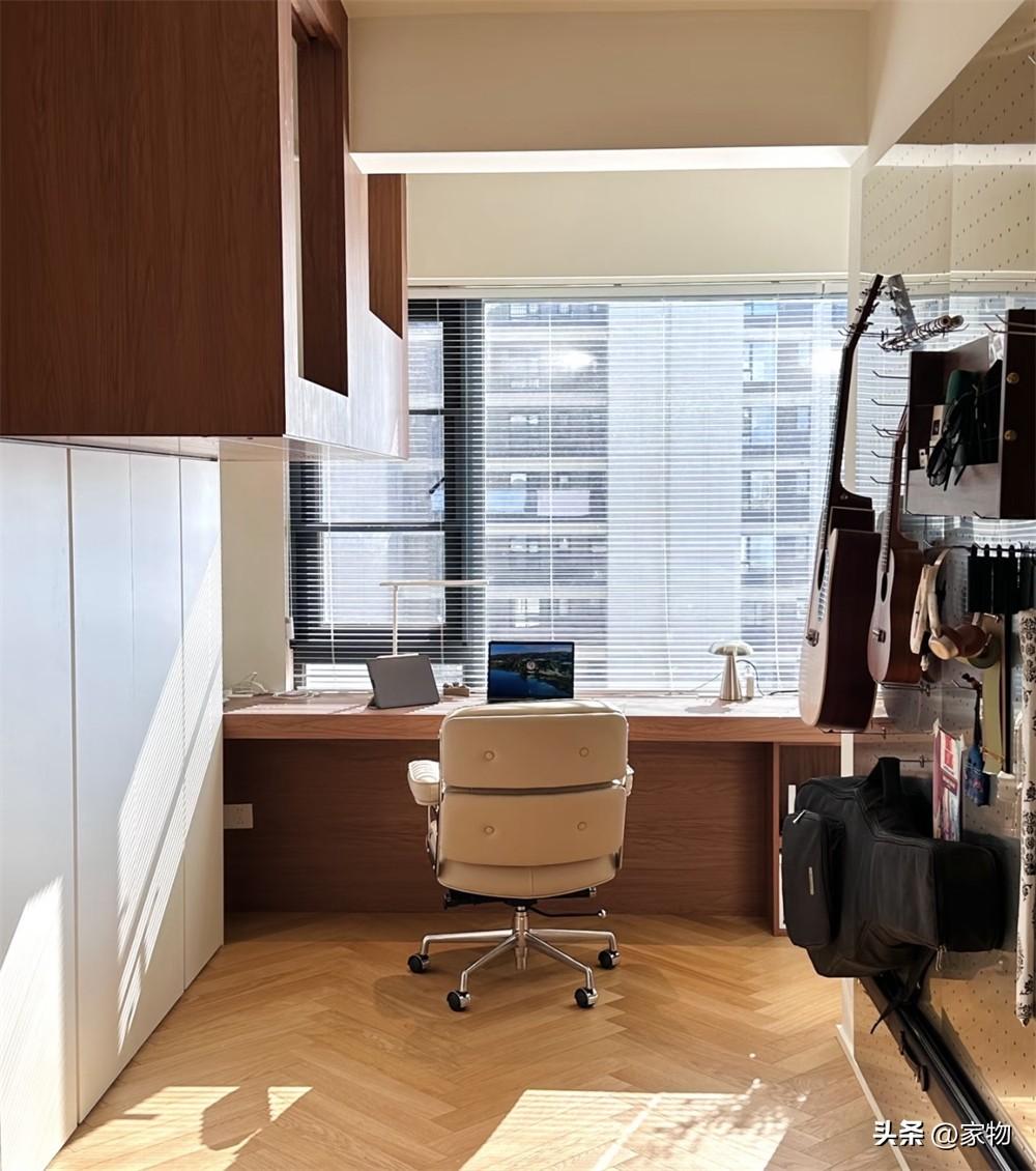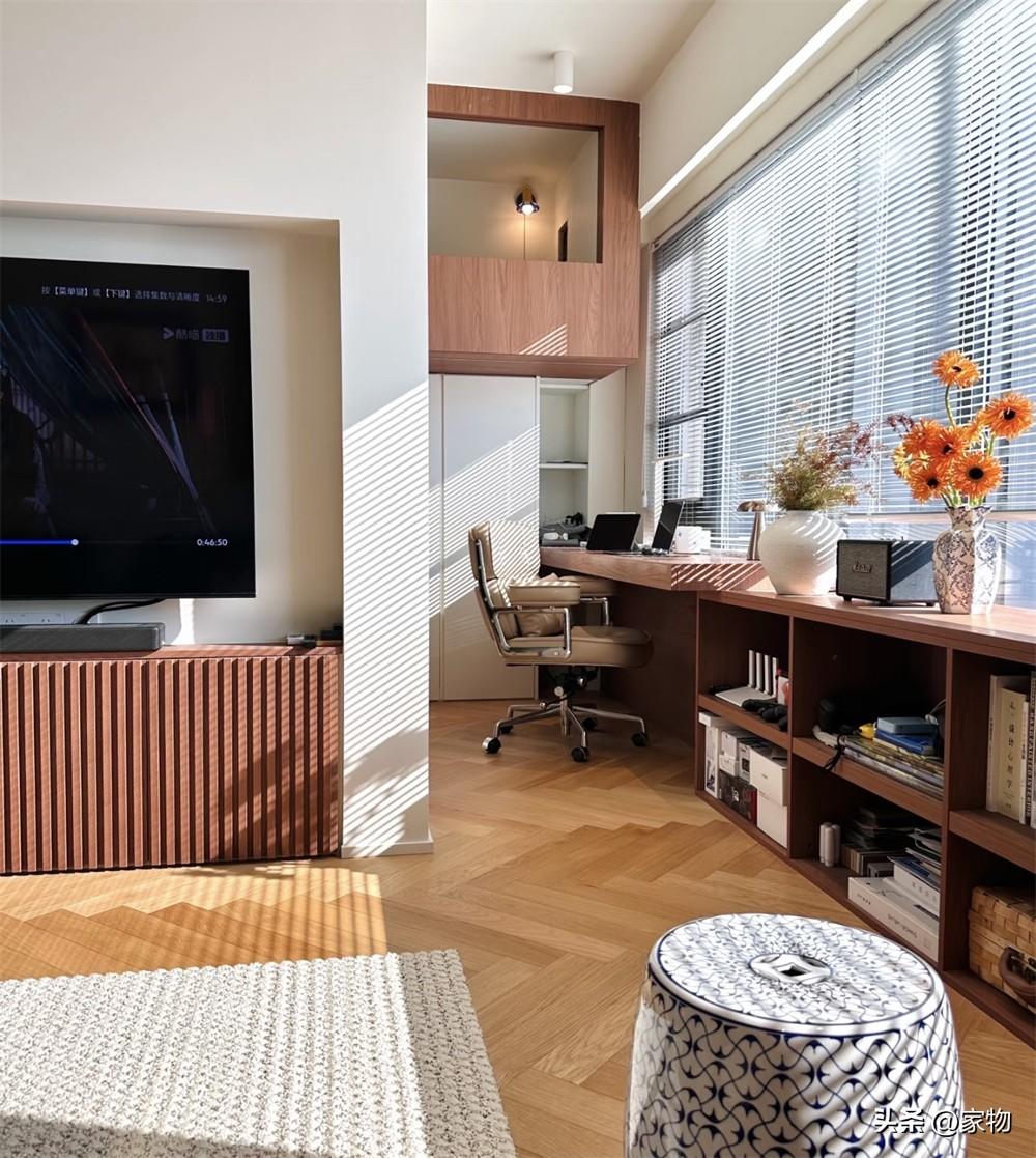 在陽臺打通後,直接在朝窗戶的地方做一條長桌,雖說擋住了落地窗,卻也不怎麼影響正常採光通風,白天甚至還要用百葉窗遮擋陽光避免晃眼。