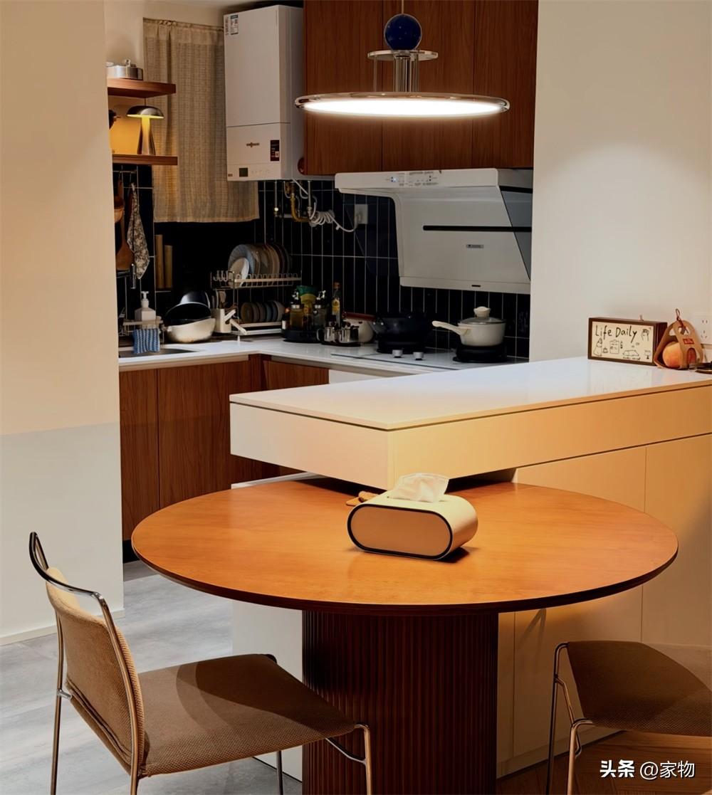 日常兩人生活時候,可以將餐桌推入小小的凹槽格位中,既解決了圓形餐桌比方形餐桌佔地的問題,又不至於在家裏來親戚朋友時,會有坐不下的窘迫,更不用說這方圓之間,美感盡顯了。