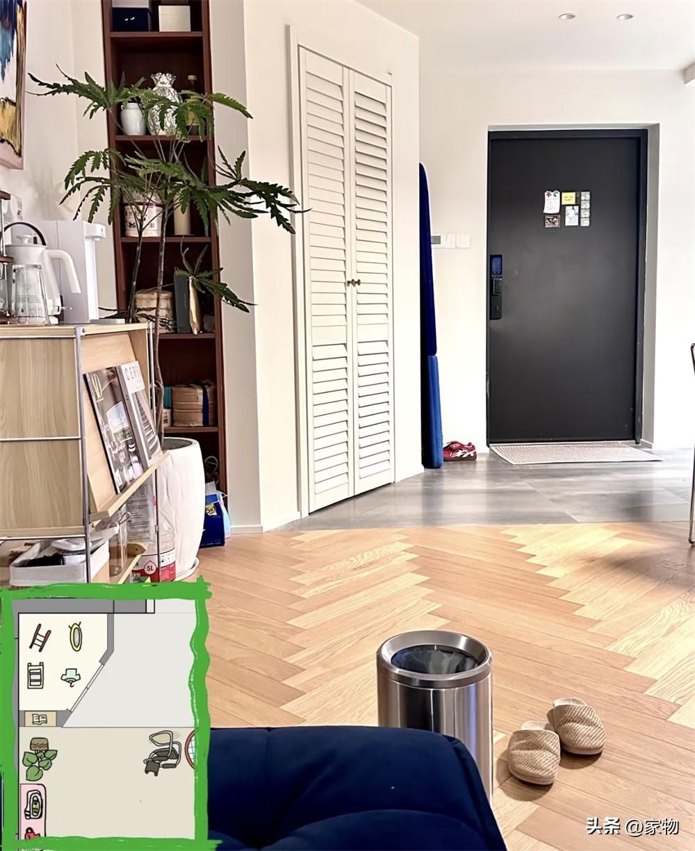 這對小夫妻家裏一進門的玄關處,就做了一道斜切牆面+百葉窗門的800庫,不僅讓入門玄關變得開闊明亮,又能收納鞋服和一系列隨身物品,避免入戶區域雜亂。