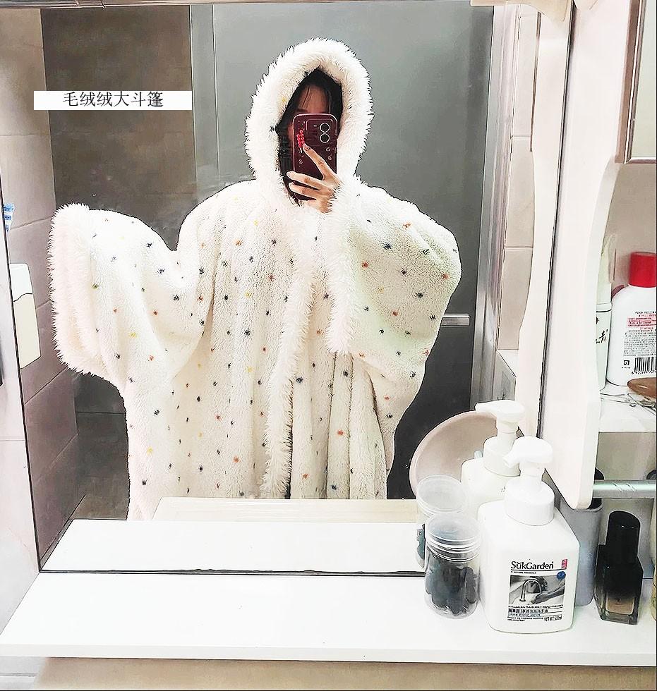 從脖子到腳踝都被長絨毛緊密包裹,帽子一戴,寒風徹底隔絕,裏面穿件薄睡衣就足夠暖和了。