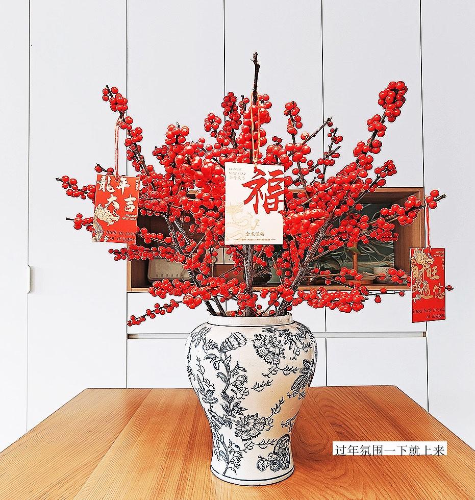 它的枝條上密密麻麻綴滿了紅寶石般的小果子,熱烈又喜慶。隨便插在一個簡約的花瓶裏,瞬間就能點亮整個角落。