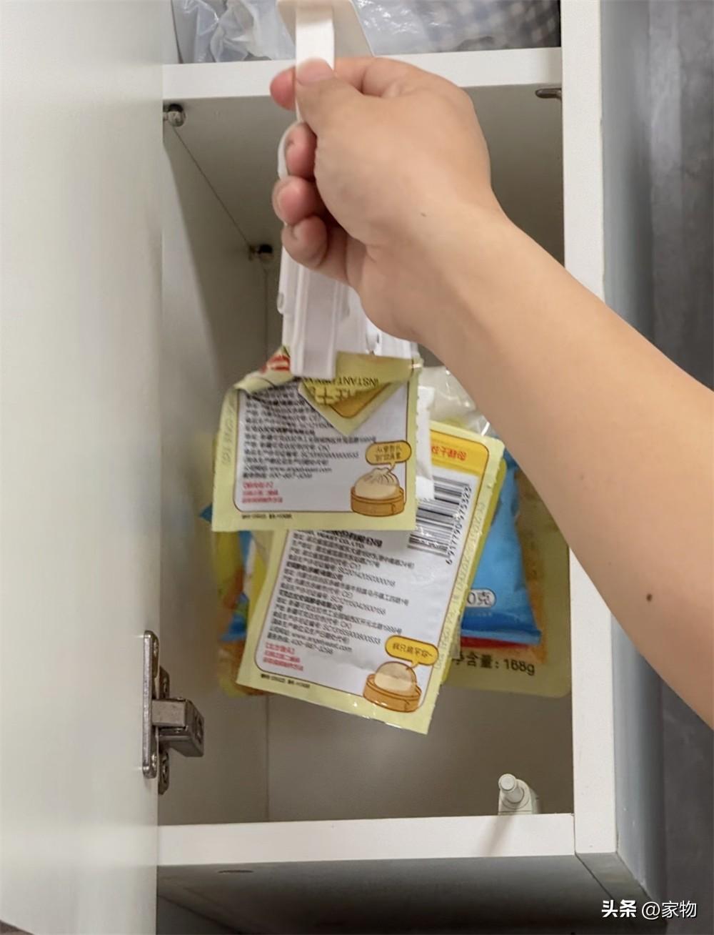 就比如油煙機兩側的吊櫃,往往要留出煙道,又窄又深,放點什麼都不方便;但自從安裝了一個帶夾子的吊頂滑軌後,就可以收納酵母粉、鹽糖袋等沒用完的調味品,同時起到封口和收納作用。
