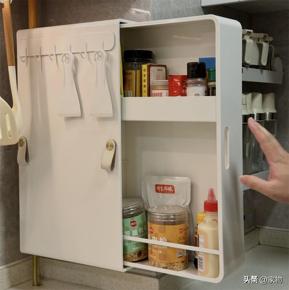 又比如廚房公共煙道外凸的位置,貼上一個收納盒,上下兩層都可以收納調味品和瓶瓶罐罐,抽拉式打開,也比直接掛在牆上方便拿取(且能防油煙)。