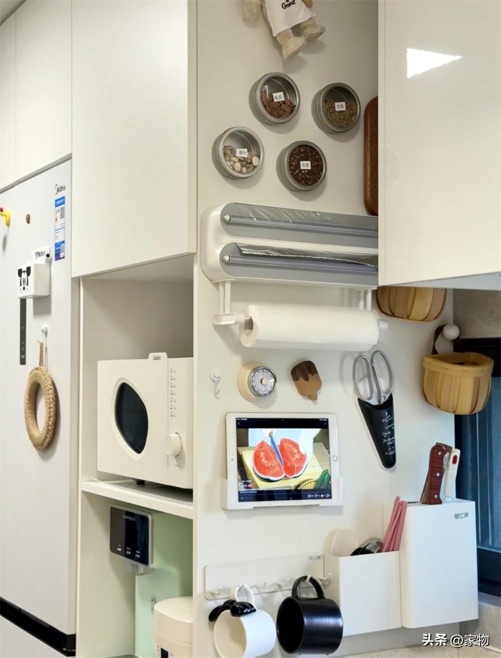 一些調料盒、定時器、剪刀乃至刀架砧板架,都可以吸附在上面,別擔心不牢固,現在有好多這種磁扣吸附效果都很不錯,甚至有空間冗餘,還可以貼點冰箱貼當做裝飾,放個PAD做菜時候看菜譜、聽歌,都很不錯。