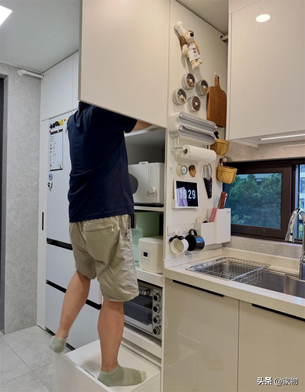 但今天我要和大家聊的,卻是另一種思路——將縱向空間利用起來,算下來,只需不到1㎡的面積就可以施展出“空間摺疊術”,將廚房雜物收納安排得明明白白。