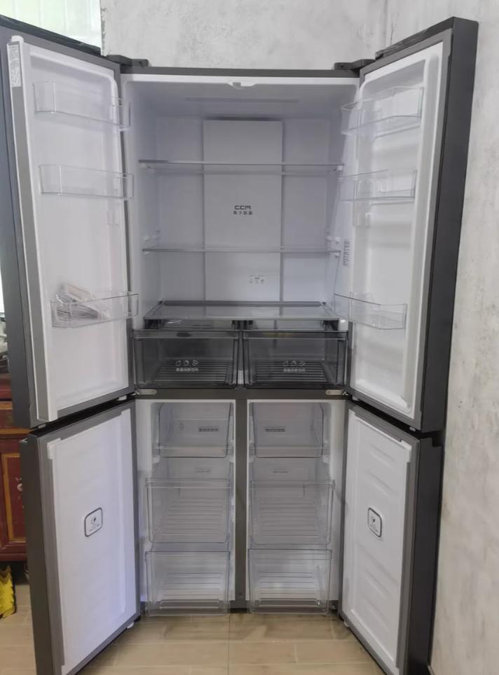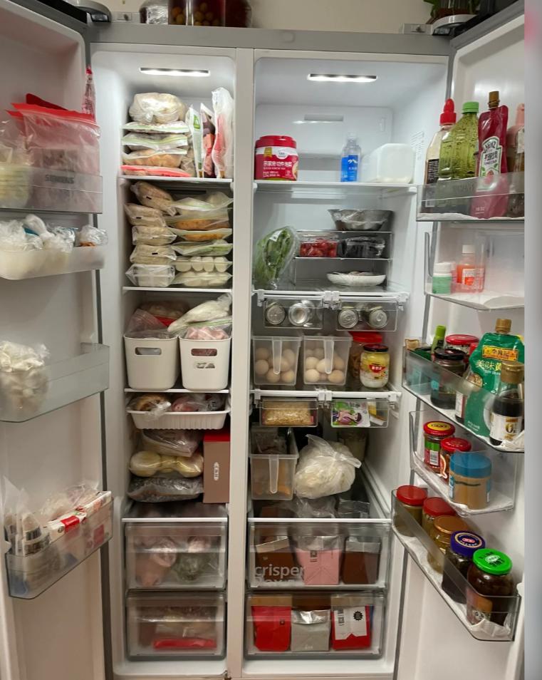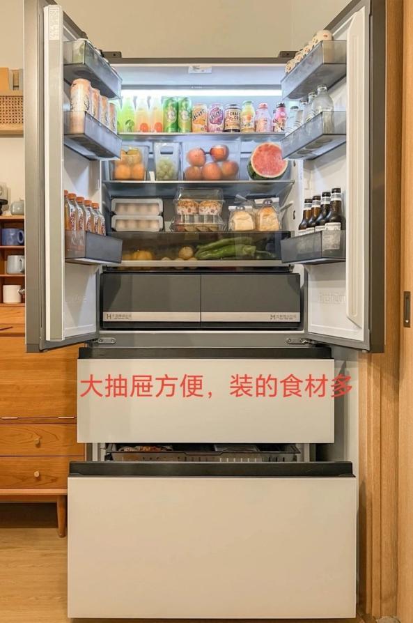 你看這種法式門冰箱,尤其是“法式四門”(還有法式五門等等),冷藏區沒有隔板,冷凍區同樣沒有隔板,而是採用了“大抽屜”的設計。