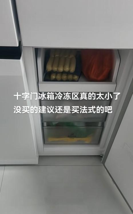 不過十字對開門,還不是最理想的設計。因爲它的冷凍區,同樣和一字門的冷凍區一樣,有隔板。所以也會存在下面這種弊端: