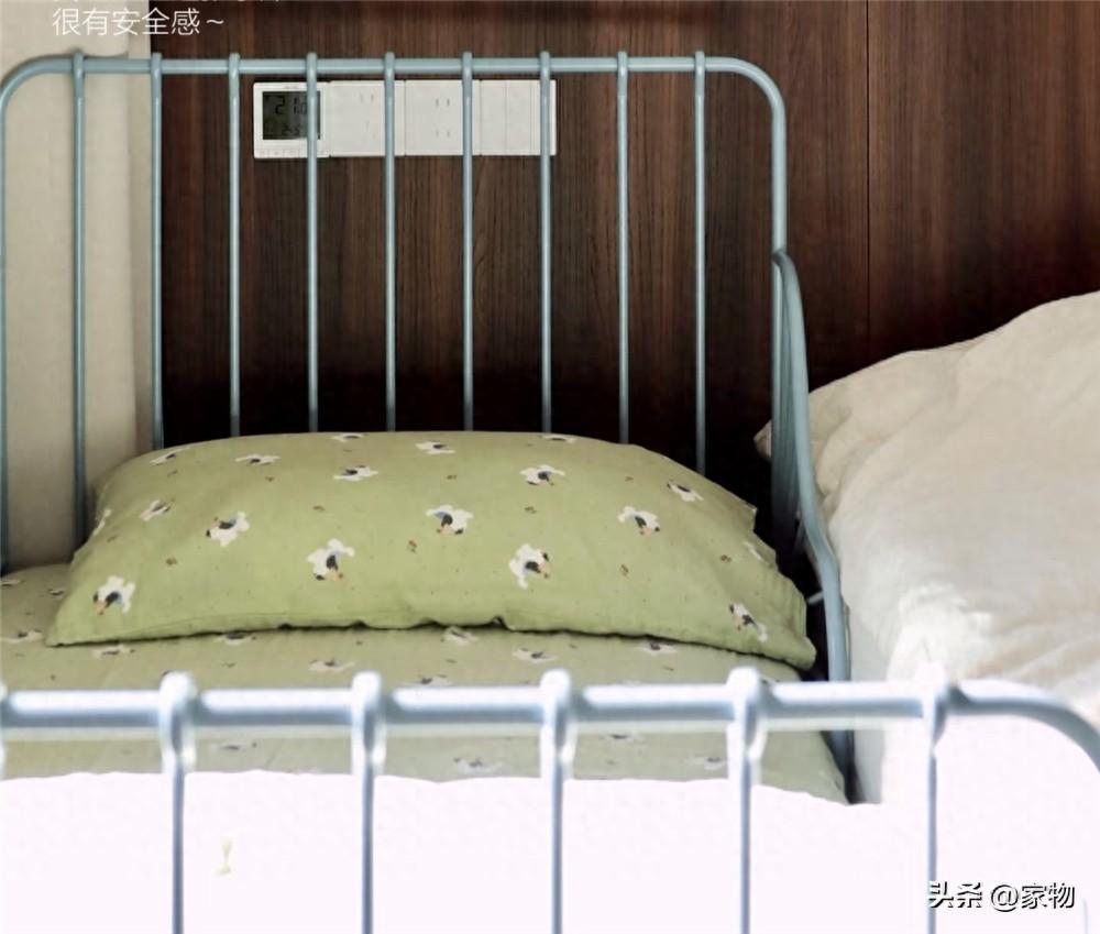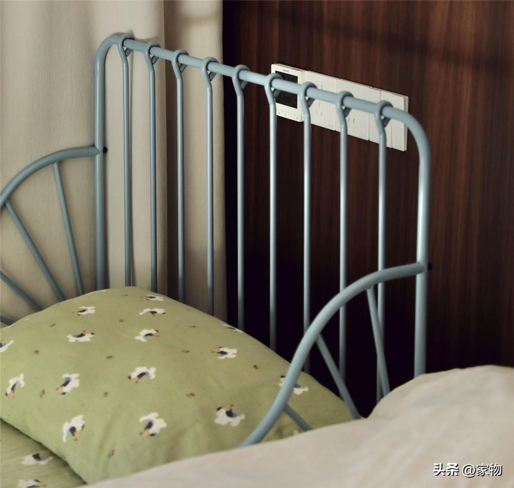 價格我記得是四百多,牀身尺寸可以加長,日常用80*200釐米剛好合適,放在主臥牀邊既方便照看孩子,又不會佔用太多的空間,更不用說這藍灰色的鐵藝架子,簡直美到了我的心頭上。