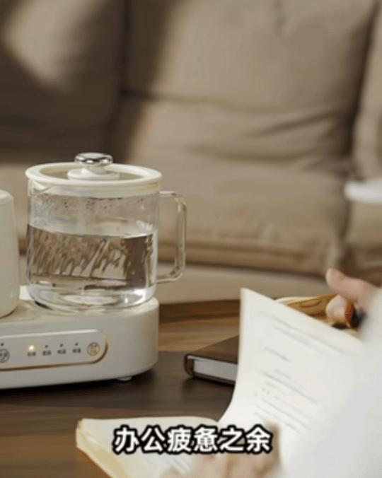 陶瓷杯和煮水壺都是配好的,右邊煮花茶、牛奶,左邊保溫咖啡、奶粉等。