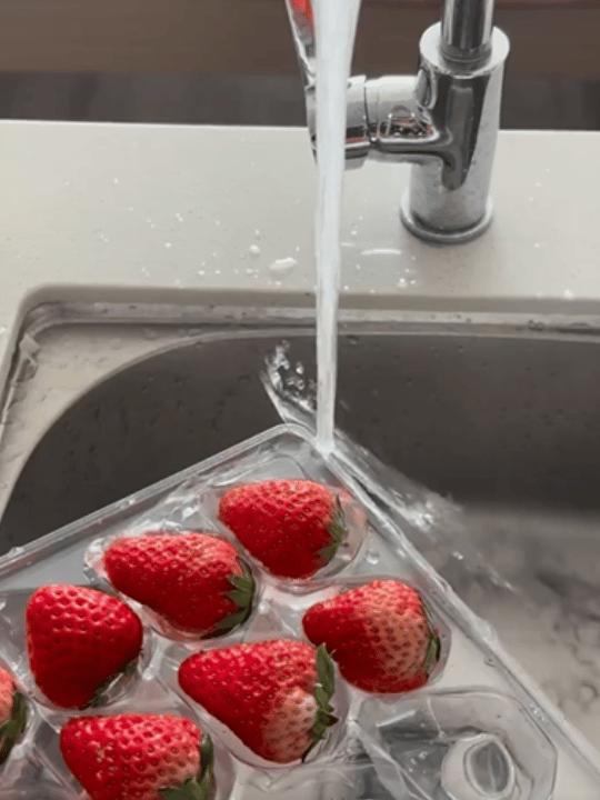 此外,分享個有意思的:這種包裝的草莓盒,一衝草莓可以打轉,可以讓洗草莓變得不枯燥。
