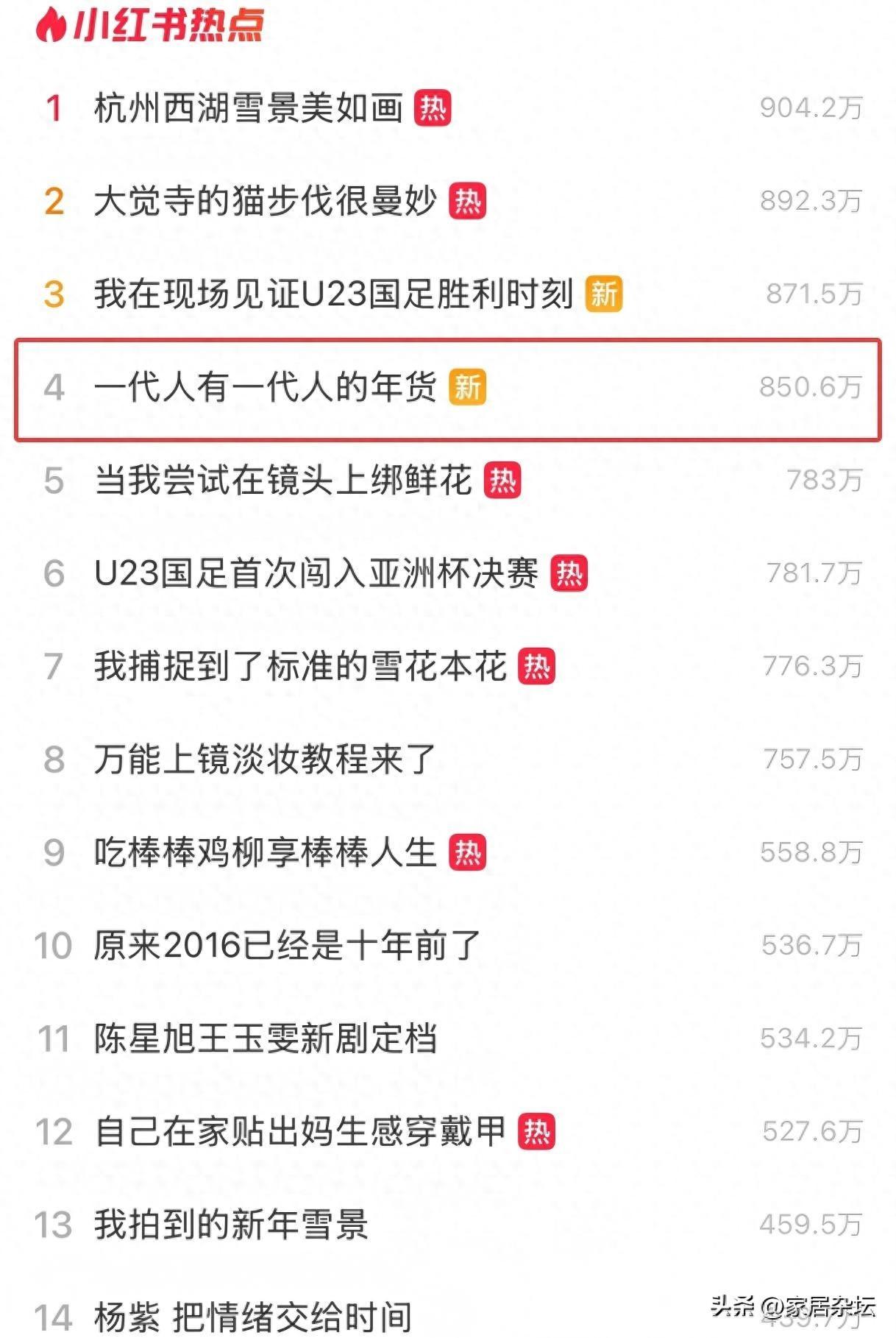 緊接着,一波新的年味熱潮又悄然興起,不少網友在社交平臺曬出自己的春節備忘錄和年貨計劃,新手爸媽們更是早早做好了帶娃回家過年的各種攻略,#一代人有一代人的年貨#也順勢成爲春節前夕的熱門話題,大家都在以自己的方式,奔赴一場獨屬於新年的團圓與熱鬧。