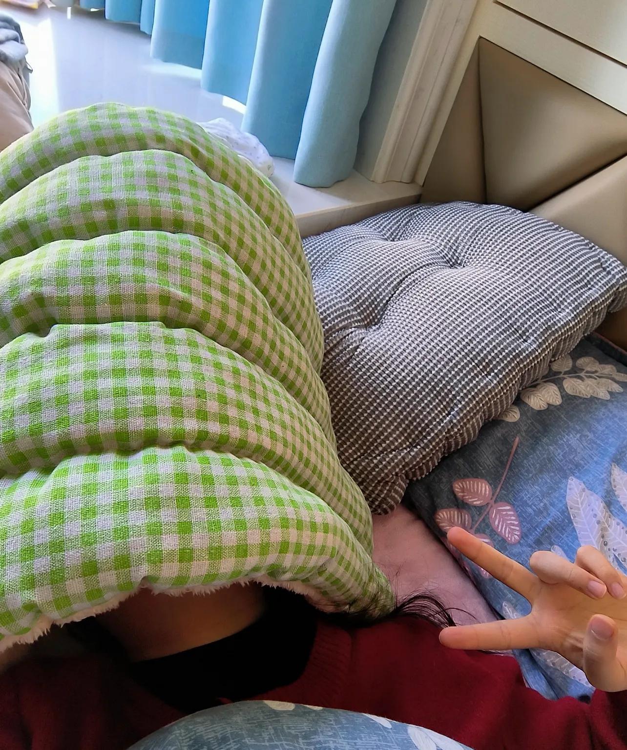 給裝衣服用的布藝收納箱上覆蓋睡衣、枕頭,做出一個頭部帳篷來,空間略小,但應付偏頭痛足矣。