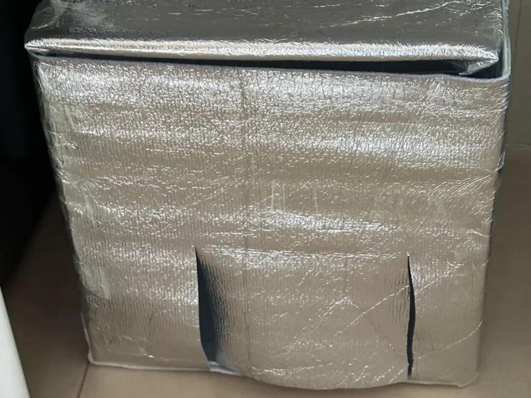 我們可以選擇一個尺寸相對大一些的保溫袋,當然了也可以選擇幾個保溫袋拼接。將其拼接一個成一個箱子的形狀,側面留口。