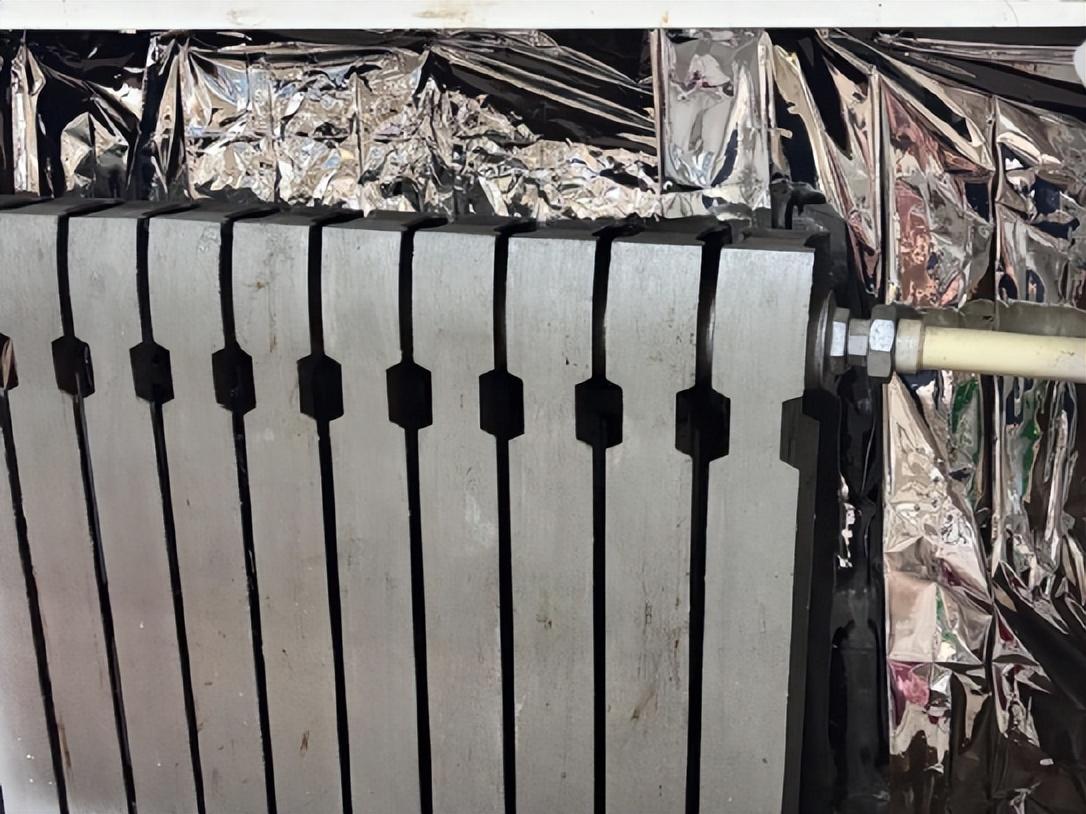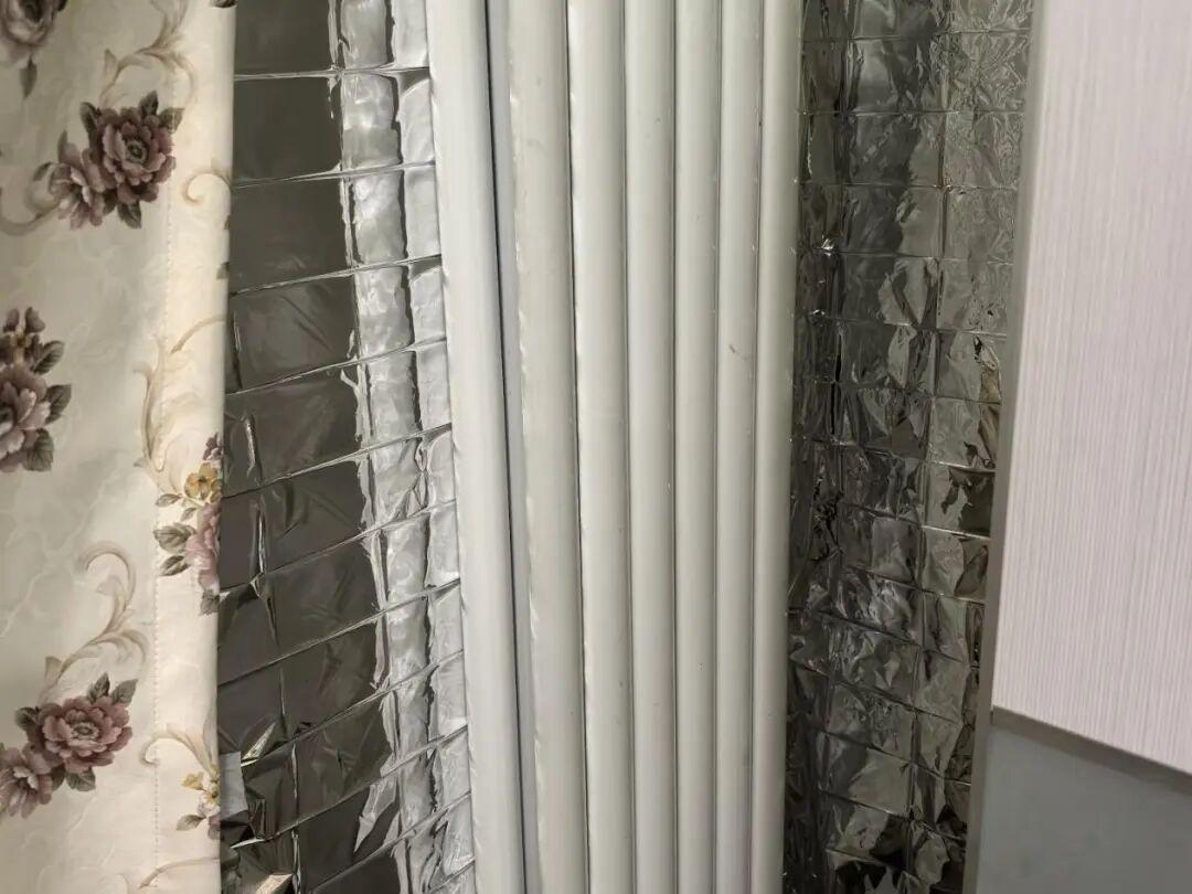 將保溫袋裁剪成片狀,然後粘接在一起,組裝一個比暖氣片略大尺寸的平面。然後將鋁箔一面朝向暖氣片,另一面貼在牆面上,固定在暖氣片後方的牆體上。
