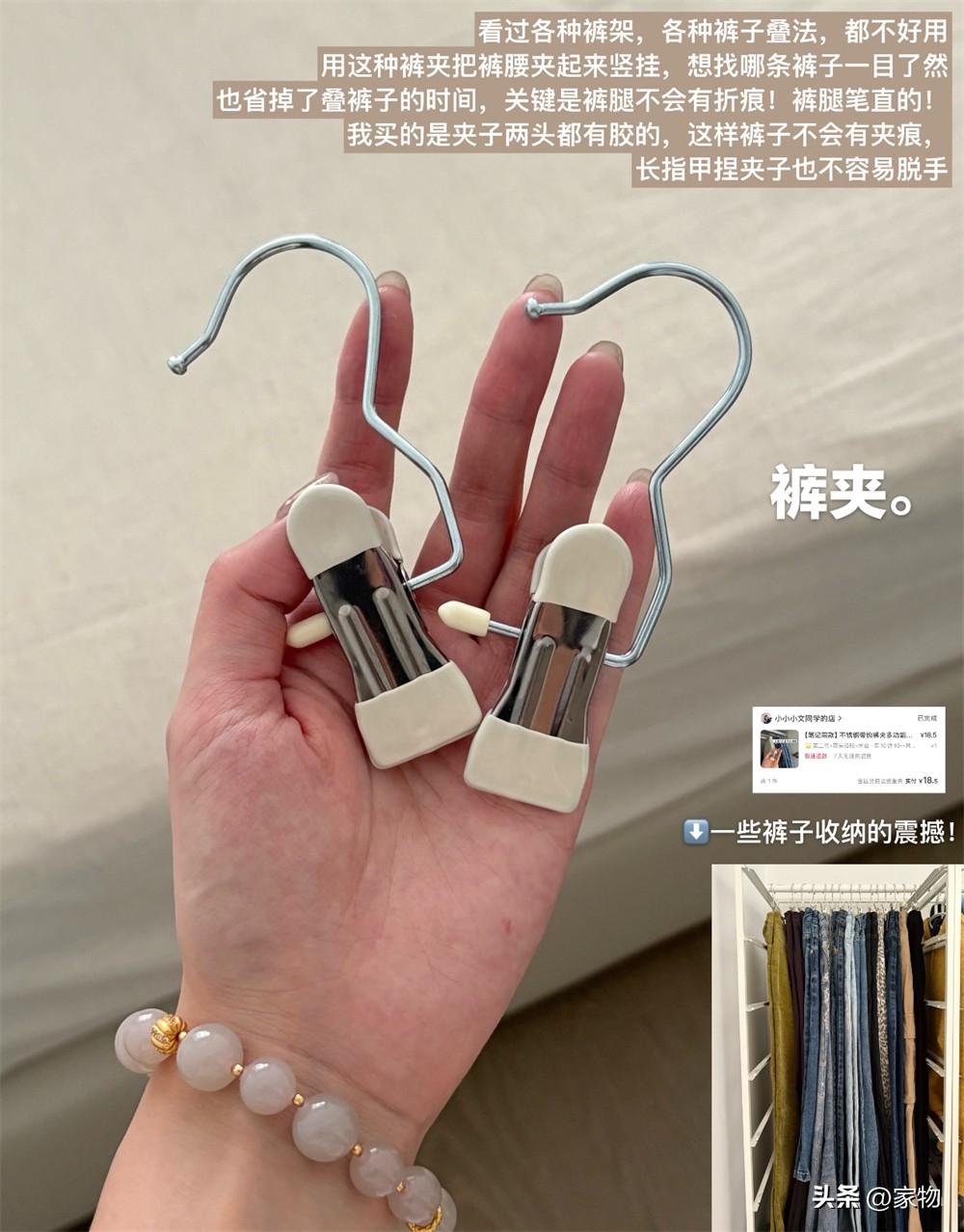 要說收納靈活,還得是這種單掛鉤的褲夾,無論是哪種褲子疊法,或者乾脆不疊,都可以用它來進行收納,夾子足夠緊實,頭部還帶有防滑膠,掛褲子穩穩當當地,偶爾掛個內衣襪子什麼的也都OK。