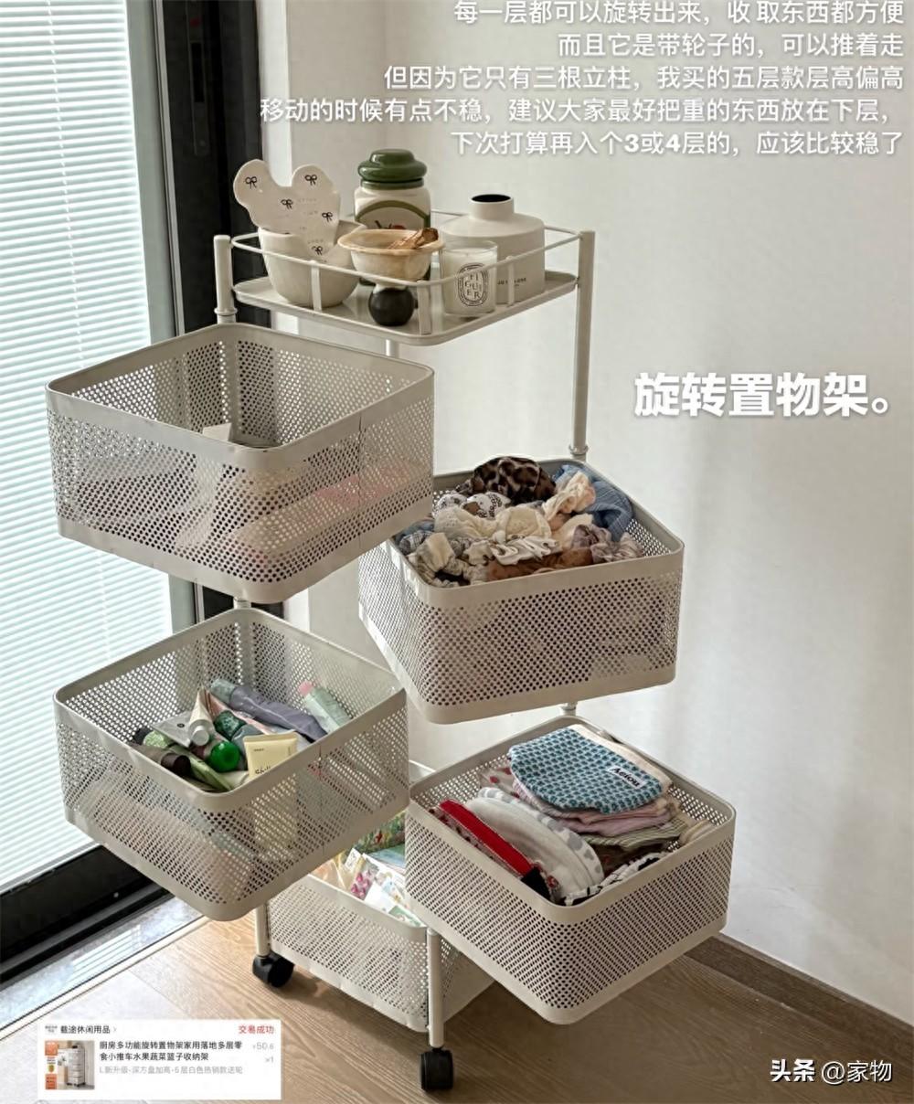 我真的強烈推薦大家試試這種多層旋轉式置物架推車,它一共有五層網籃,可以收納各種雜物,即便是隨手丟進去,只要旋轉堆疊起來也不會顯得亂,更不用說,頂部還相當於有個置物臺,無論推到家裏任何空間角落,都能讓雜亂空間快速變得整潔起來。