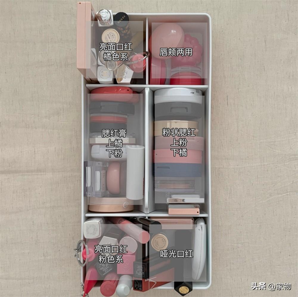 我自認收納得也還算有條理,上下小格分別收納我茫茫多的口紅,中間收納腮紅和粉餅,都放到裏面,呈現出一種亂中有序的觀感,我還是挺喜歡這種“雜貨鋪”風格的收納方式的,很有生活氣息。