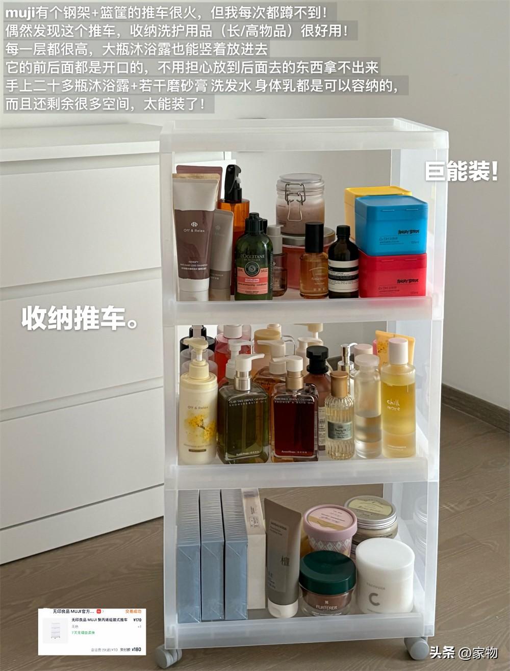 一開始我是看上了無印良品那個金屬籃筐的小推車,但最後還是覺得太貴了,就買了這種塑料材質的,用起來的效果是一樣的,放一些衛生間的沐浴露,水乳,或者其他的化妝品護膚品完全OK,放在洗手檯旁也不怎麼礙事兒。