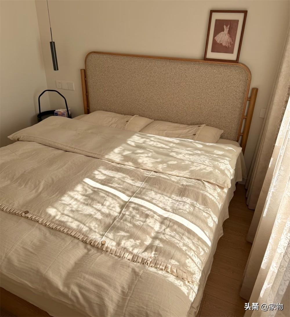 最後一間次臥室,彷彿又換了個風格,牀鋪更偏向原木風、日式風,陽光透過紗簾投射到牀上,真正讓室內空間實現了“白而不冷”的效果。