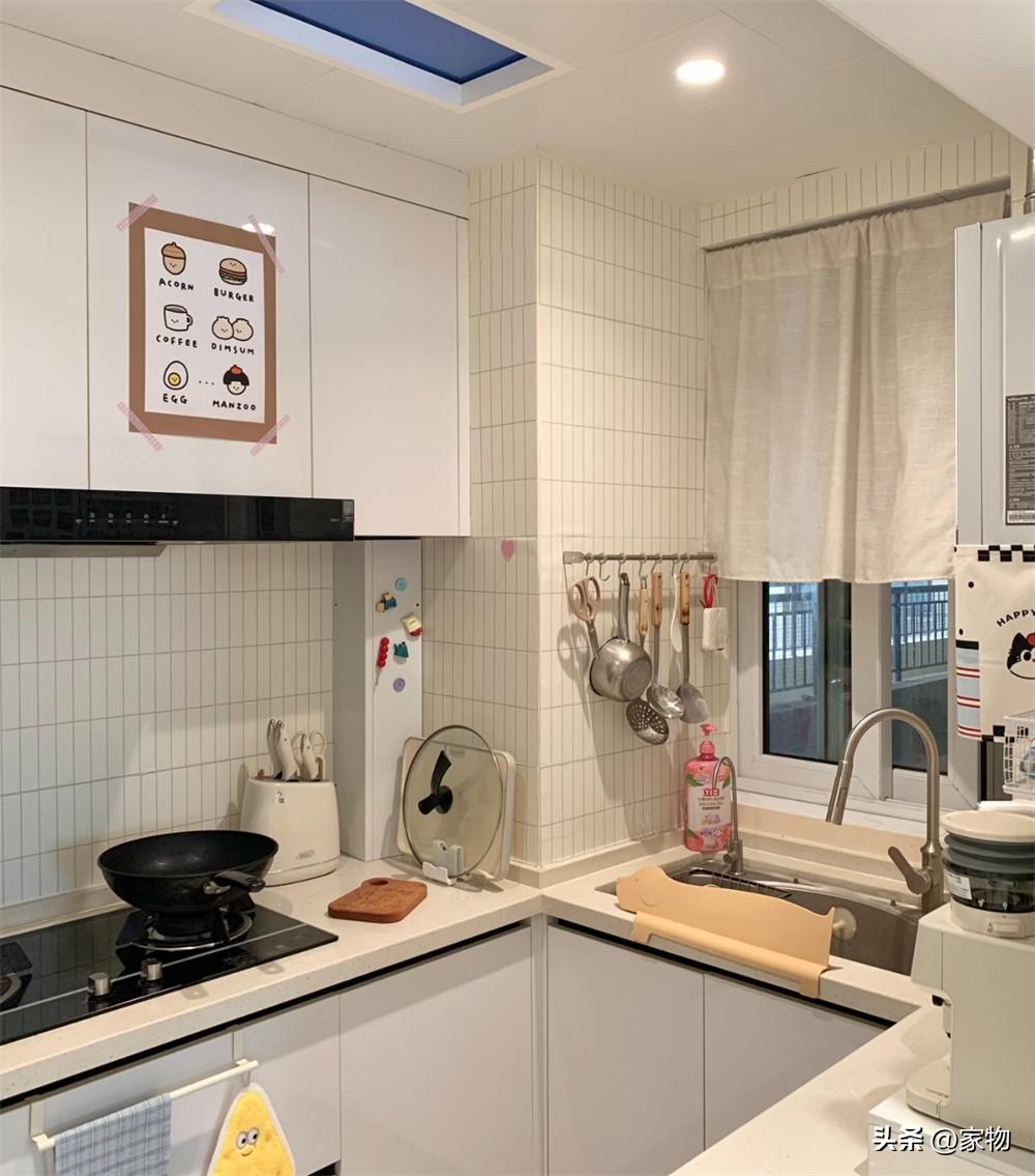 廚房是半開放式格局,窗戶正對着外面的連廊,廚房內的格局是“U”字形,竈臺、水槽、切菜臺分別在三個方向,做飯時只需要一轉身就能進行下一步操作,真的特別方便。