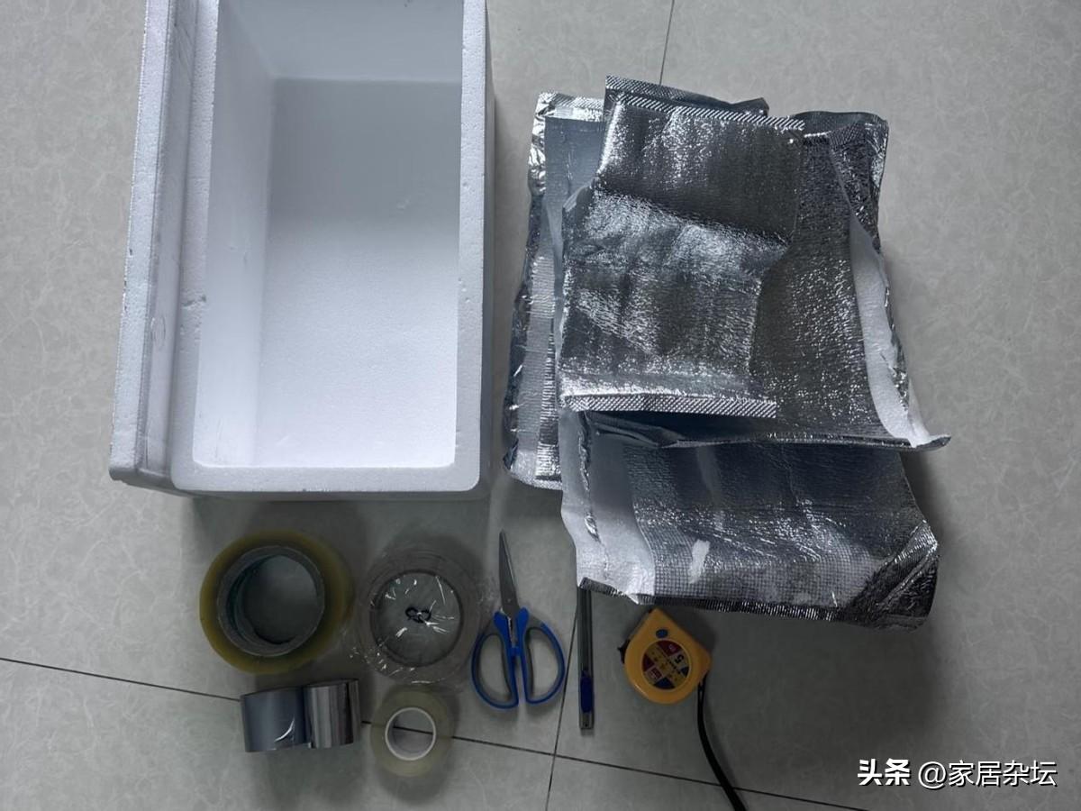 將大號保溫袋的內部清潔乾淨,然後可以找一個泡沫箱,然後把這個大號保溫袋,按照尺寸裁剪,貼在保溫箱的內部和外部。