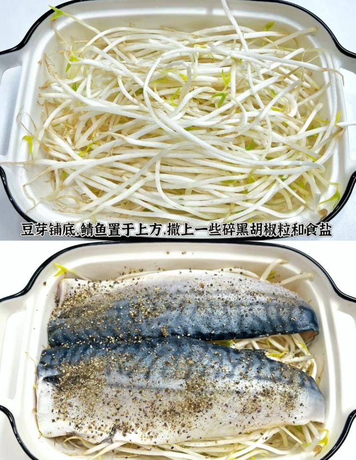 2.找個合適的容器,把豆芽鋪在下面,片開的魚平鋪在豆芽上,撒上喜歡的調料(比如黑胡椒、食鹽、孜然、辣椒等等);