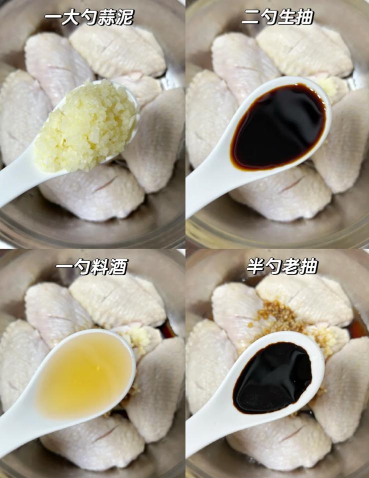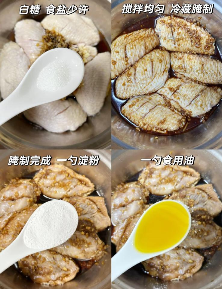 1.雞翅洗淨,加入調料醃製(可以封保鮮膜放冰箱冷藏2-3小時更入味);