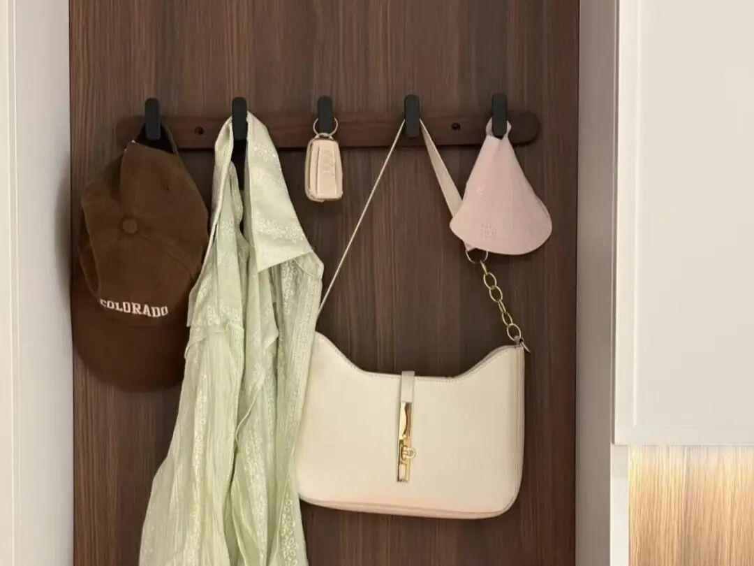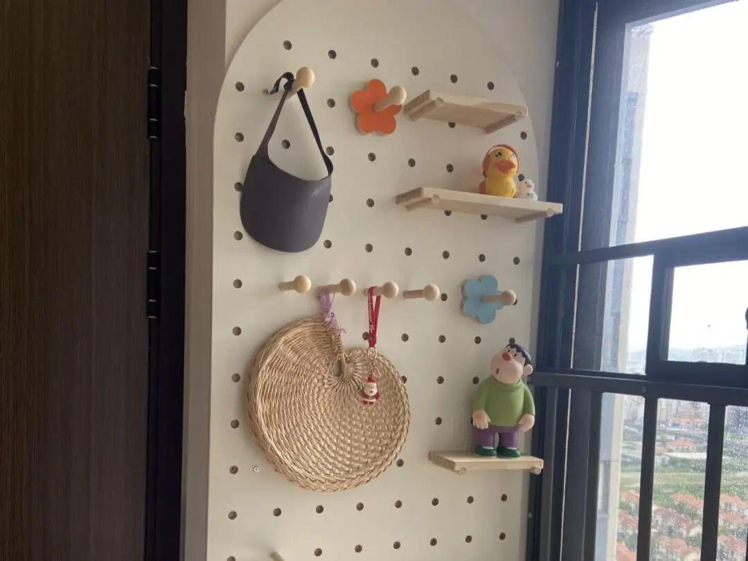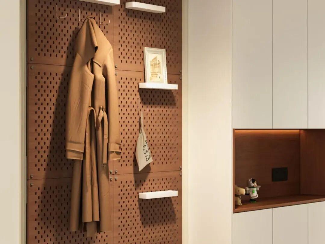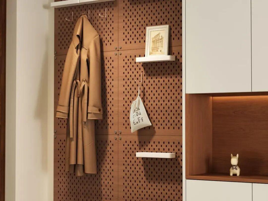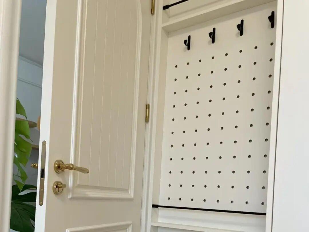 做法其實非常的簡單。在裝修的時候,只要在玄關牆面上安裝一套組合式的壁掛架,常見的就是洞洞板,包含掛鉤,摺疊式層板,還有小型的收納籃。