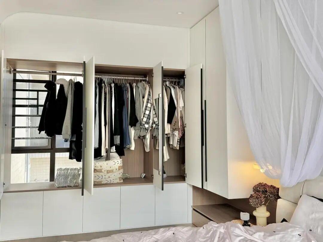 常規做法就是在臥室定製衣櫃的時候,在衣櫃內或者是側邊,專門劃分出30~40釐米寬度作爲開放區,用來掛次淨衣。