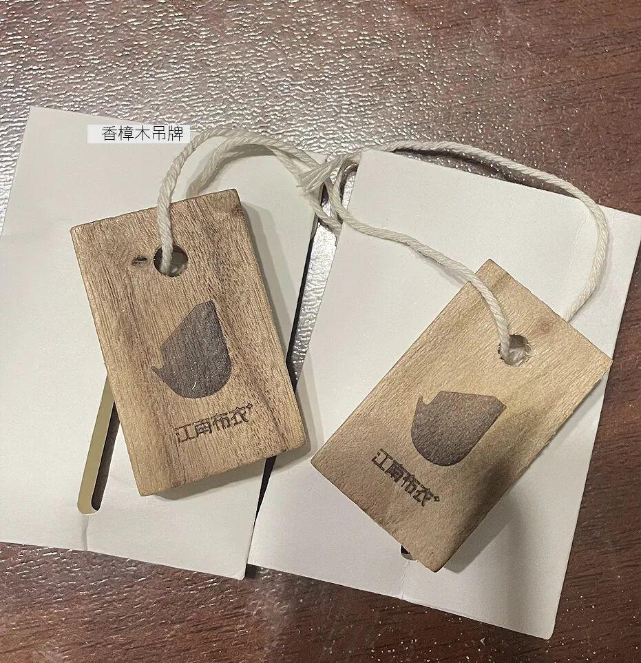 比如,利用香樟木做成吊牌,不但增加了衣服品牌的質感,客戶買回來還能放在衣櫃當香薰卡。