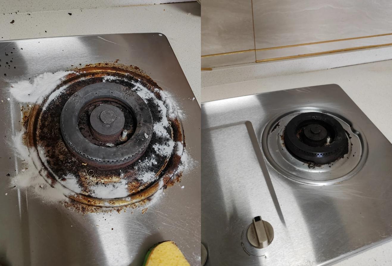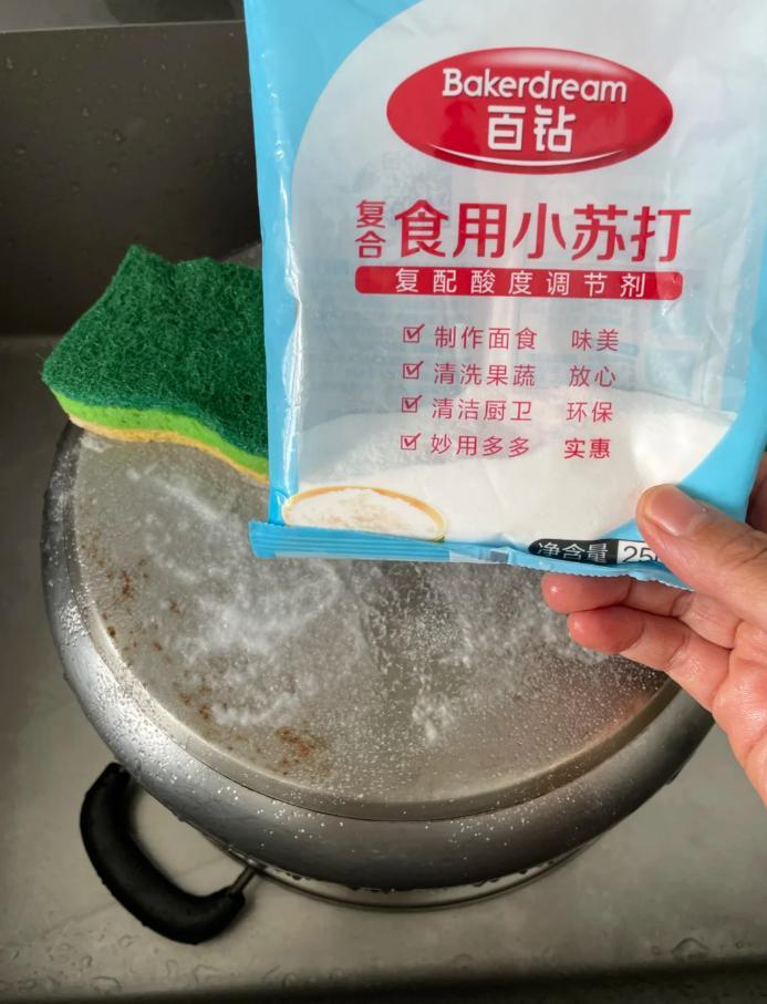 具體做法都差不多,基礎用法都是用小蘇打+熱水。比如油污清潔,小蘇打和熱水攪拌成糊狀,塗抹在油污的位置,精緻一兩個小時,再用鋼絲球或者是海綿擦擦拭就可以了。去除黑鍋底,直接就小蘇打+水燒開,浸泡一下再刷……