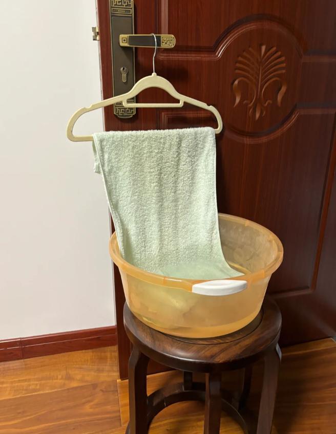 一個臉盆,裝上水,然後把毛巾的一頭浸在水裏,另一端直接用衣架懸掛固定住。這樣一個簡易的加溼器就做成了。